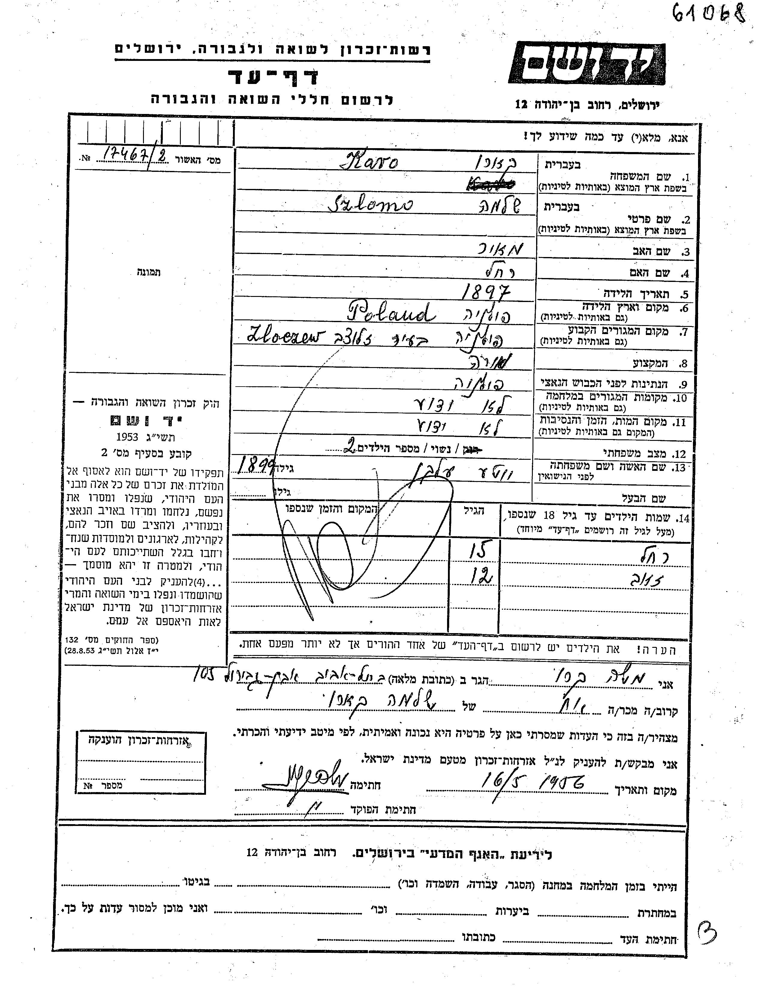 קארו | Szlomo | 1897 | Zloczow, פולין | דף-עד |