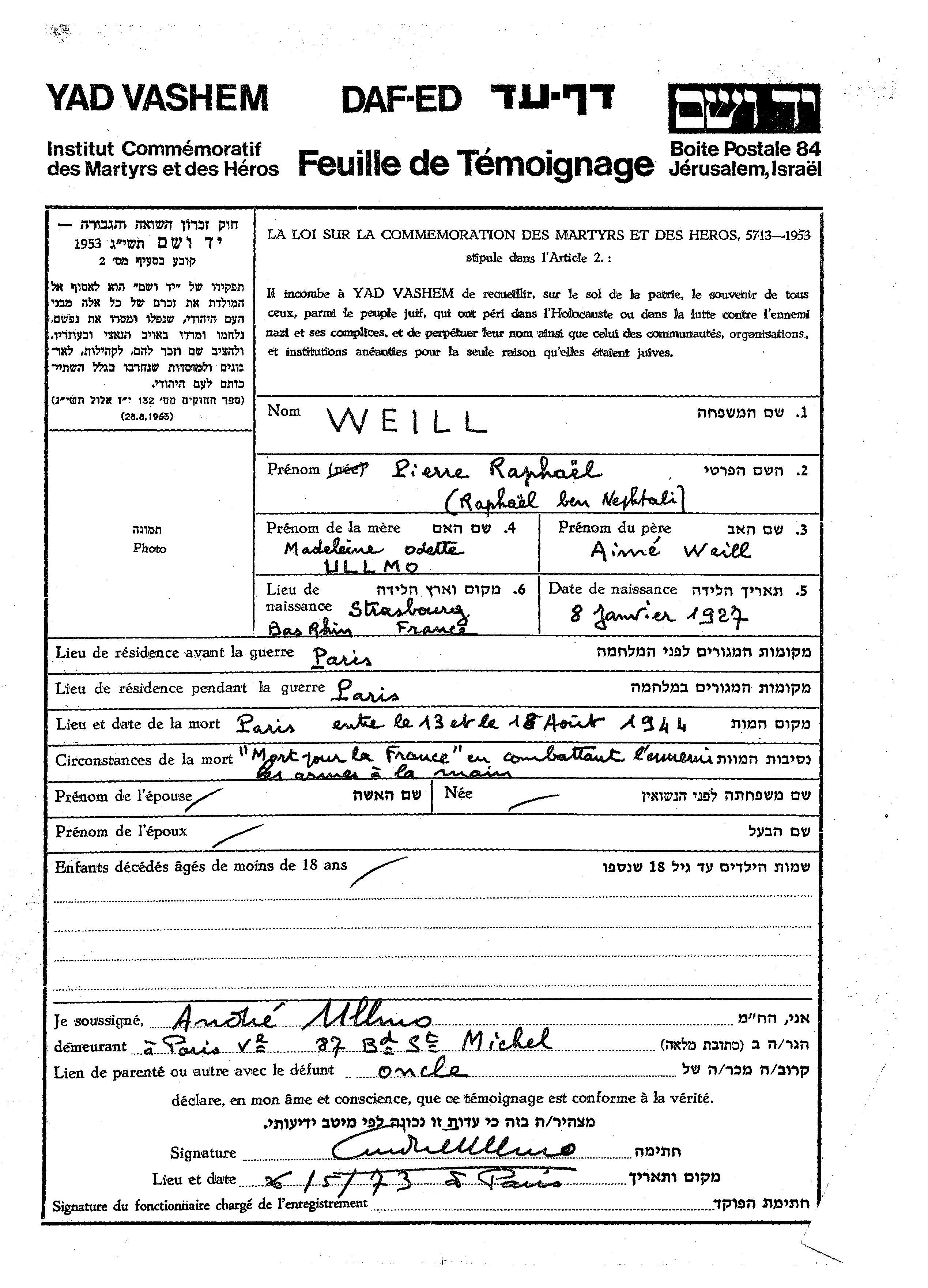 Pierre Raphael Weill נולד בStrasbourg שבצרפת בשנת 1927. לפני מלחמת העולם השניה התגורר בParis שבצרפת.