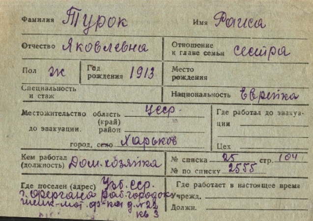 כרטסת של יהודים תושבי ברית המועצות שפונו ל- Tashkent ומשם למקומות שונים באוזבקיסטן , פברואר 1942