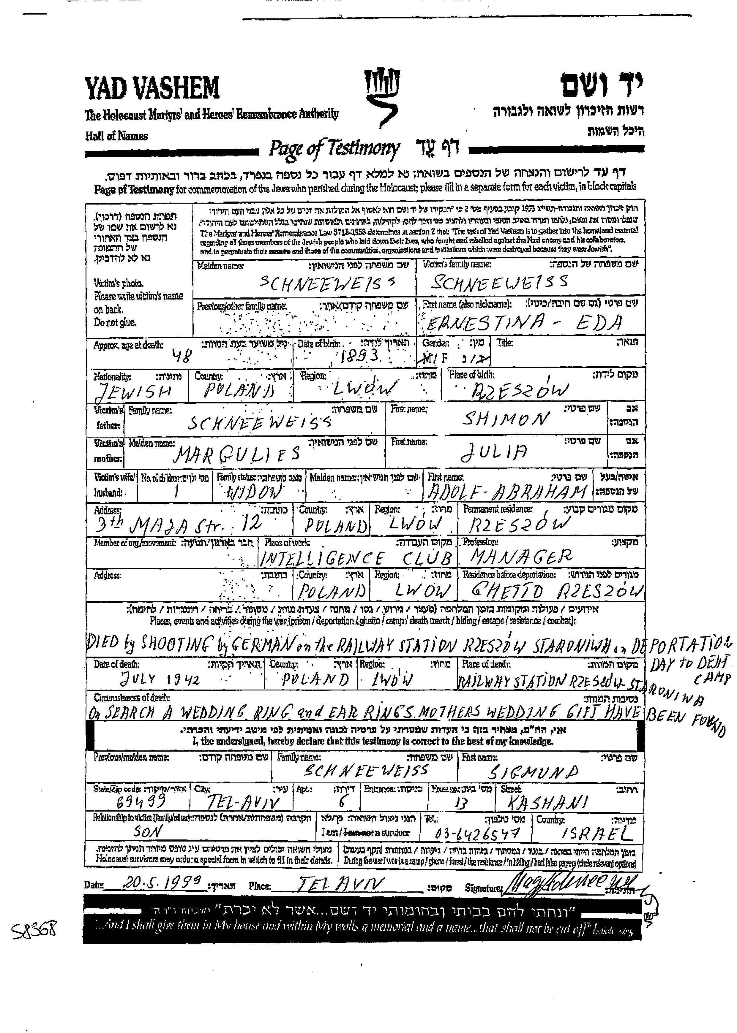 שניווייס ארנסטינה 1892 Rzeszow, פולין רשימת יהודים נרצחים מתוך ספרי יזכור