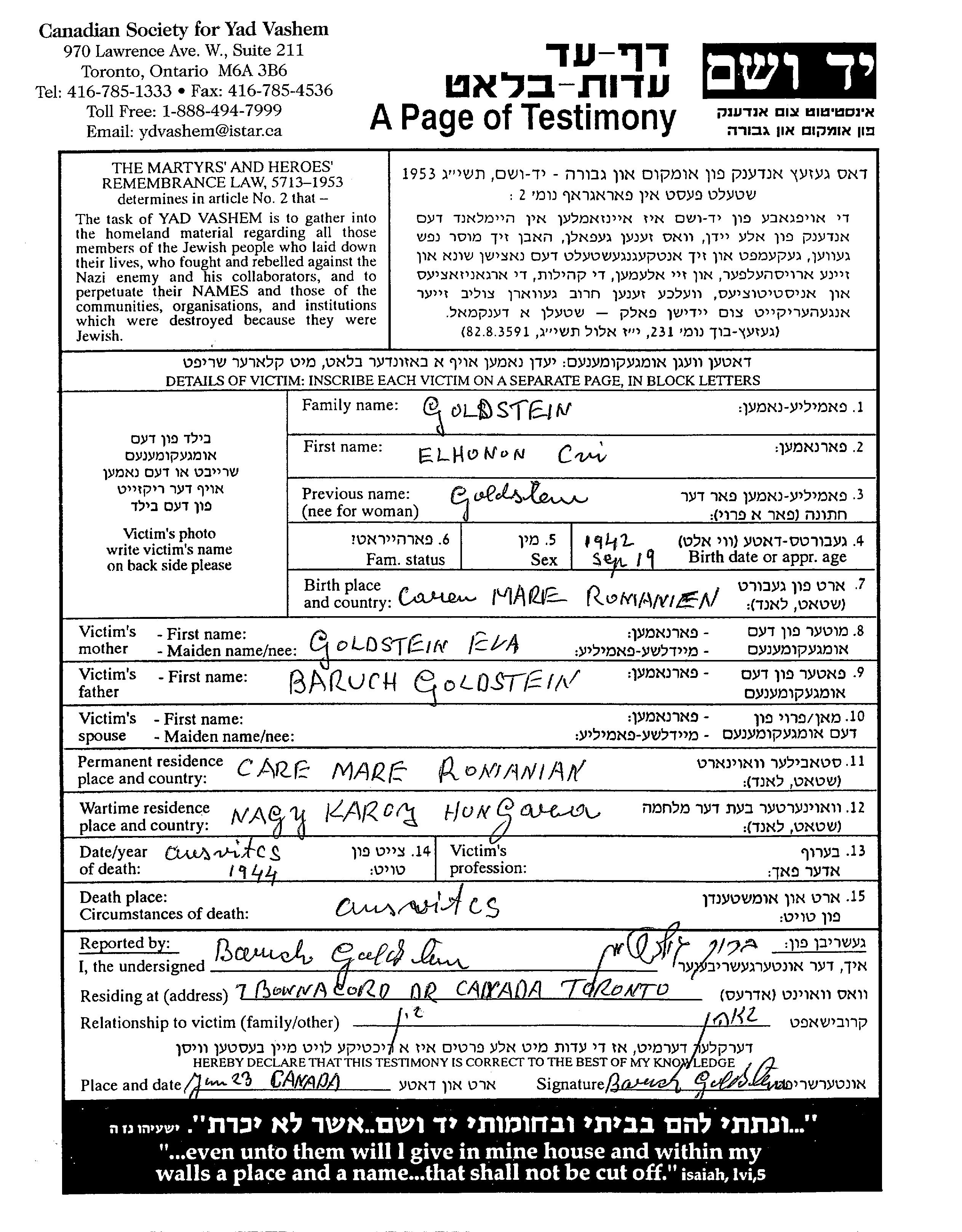 Elhonon Cvi Goldstein נולד בCarei Mare שברומניה בשנת 1942. לפני מלחמת העולם השניה התגורר בCarei Mare שברומניה.