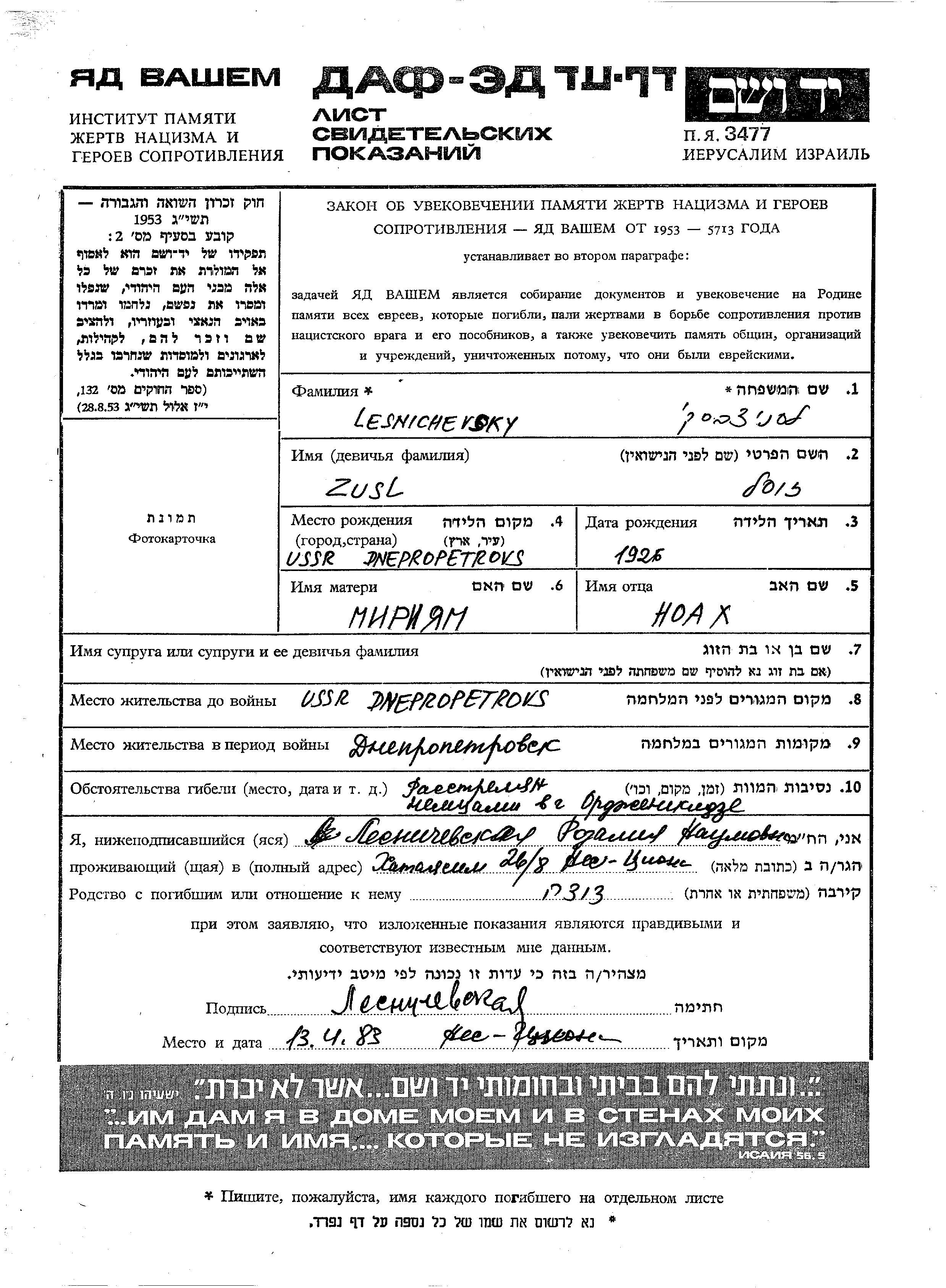 זוסל Lesnichevsky נולד בDnepropetrovsk שבאוקראינה (ברה"מ) בשנת 1925 לנח וMiriyam. לפני מלחמת העולם השניה התגורר בDnepropetrovsk שבאוקראינה (ברה"מ). בזמן המלחמה הוא היה בDnepropetrovsk שבאוקראינה (ברה"מ).