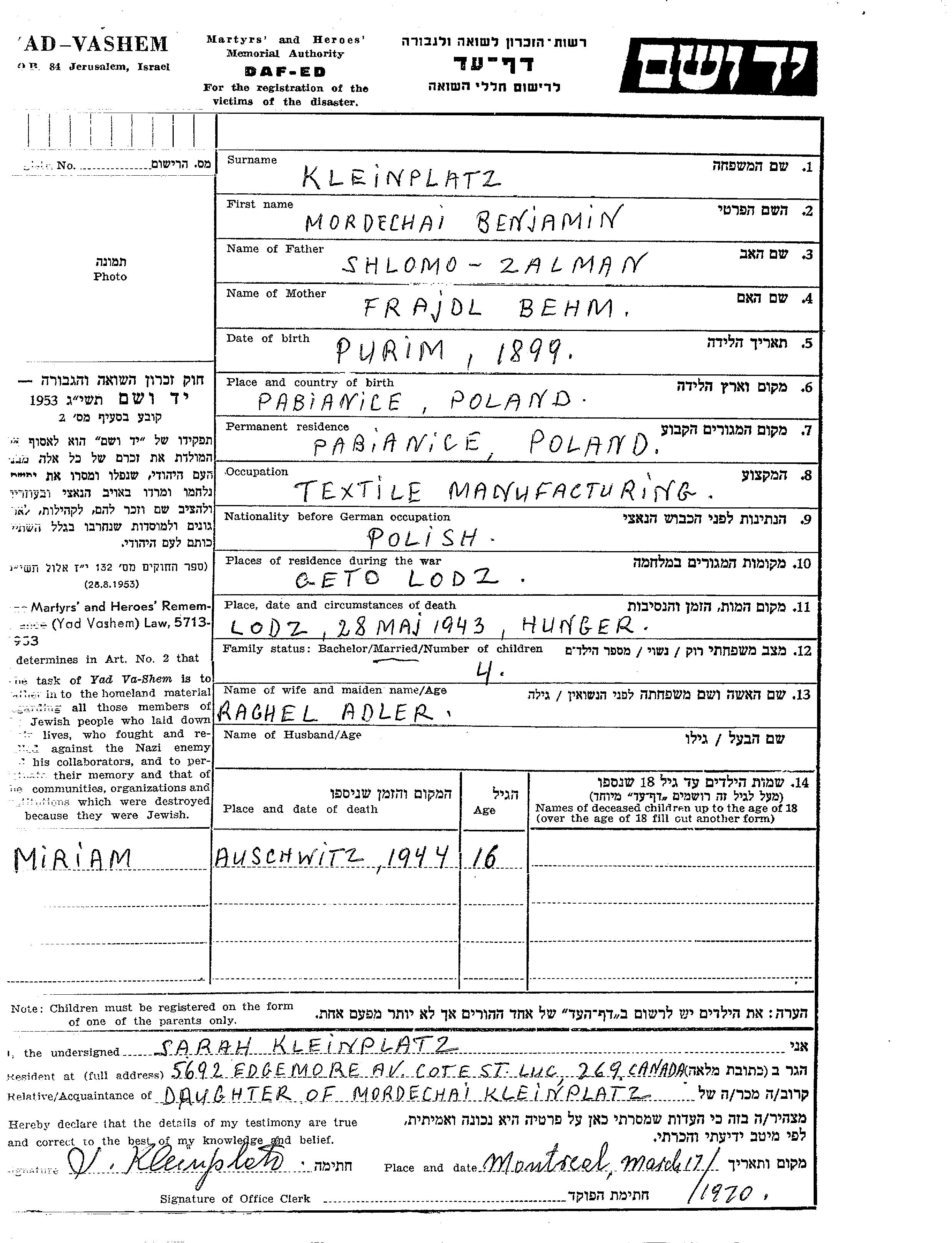קליינפלץ Mordechai Benjamin 1899 Pabianice, פולין דף-עד