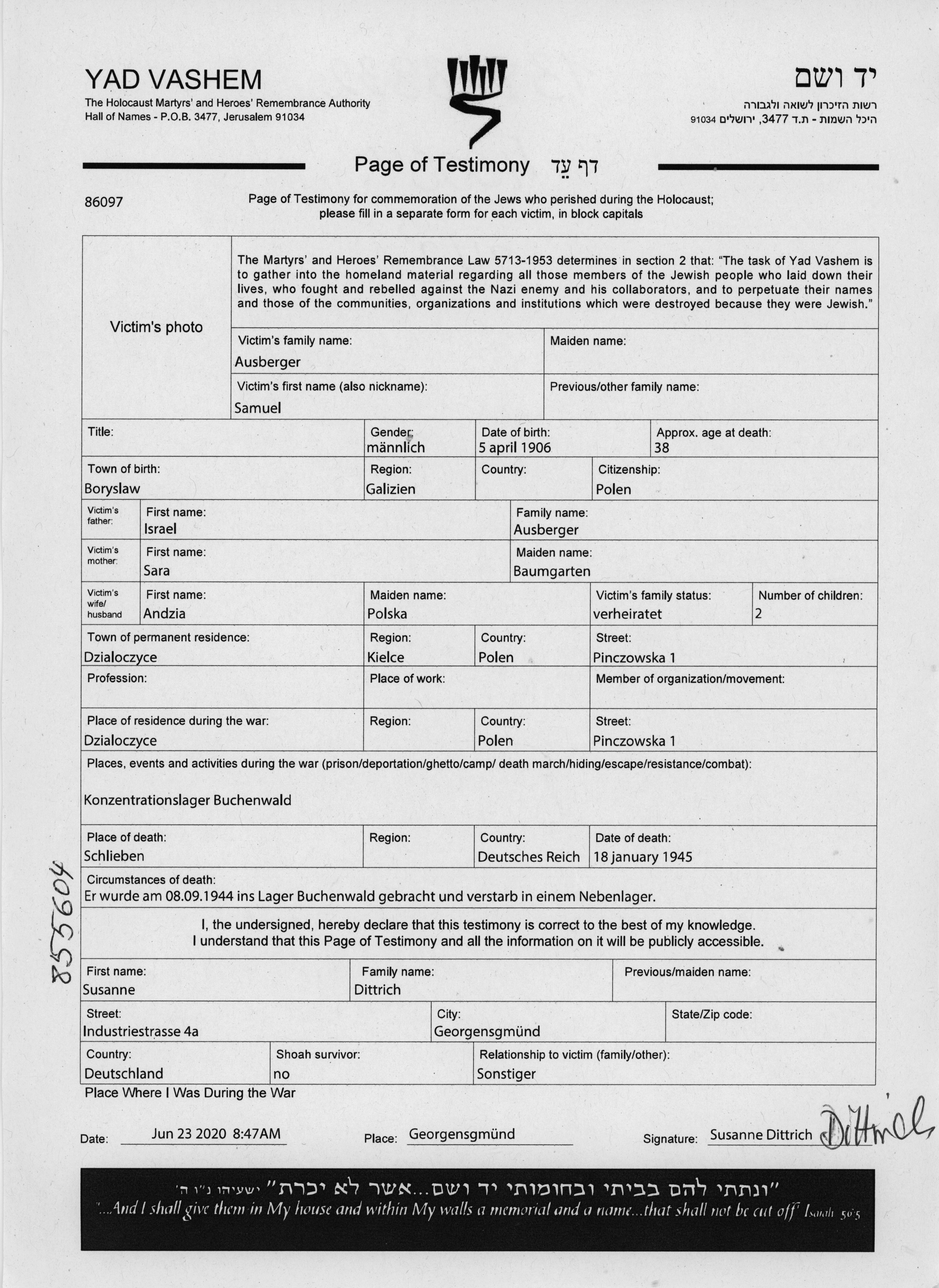 Samuel Chaim Ausberger נולד בBoryslaw שבפולין בשנת 1906. לפני מלחמת העולם השניה התגורר בDzialosice שבפולין.
