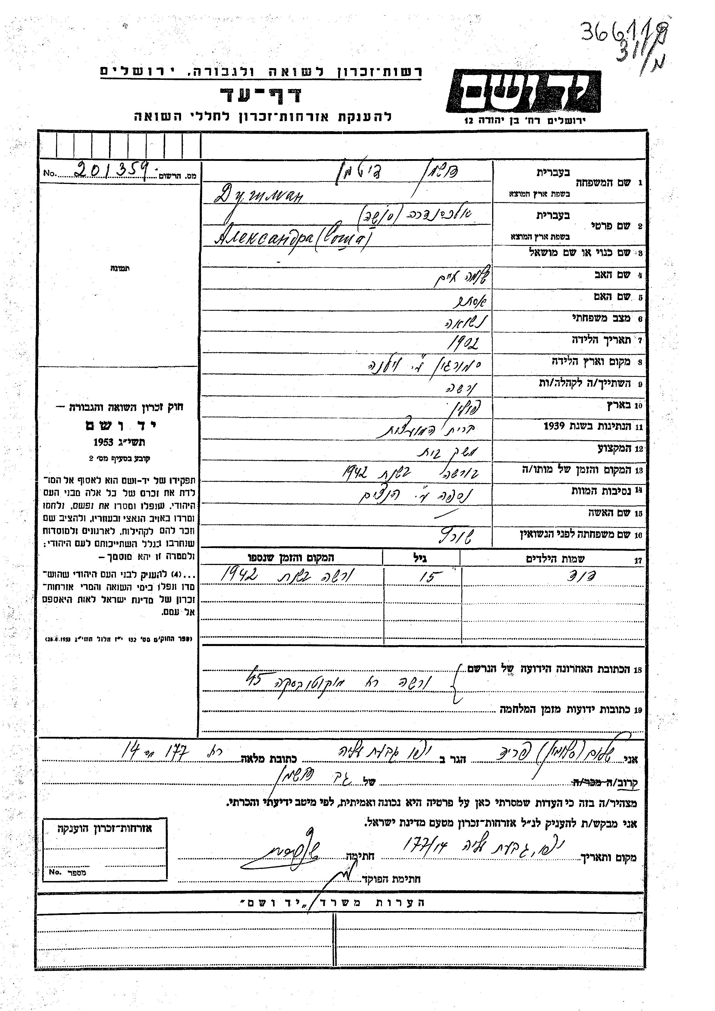 Alekcandra סושה לומה Dutman דיטמן לבית שורץ נולדה בSmorgon שבפולין בשנת 1902 לשלמה חיים ואסתר. היא היתה משק בית ונשואה. לפני מלחמת העולם השניה התגוררה בWarsaw שבפולין. בזמן המלחמה היא היתה בWarsaw שבפולין. היא נרצחה בשואה. מקום המוות: Warsaw שבפולין בשנת 1942.