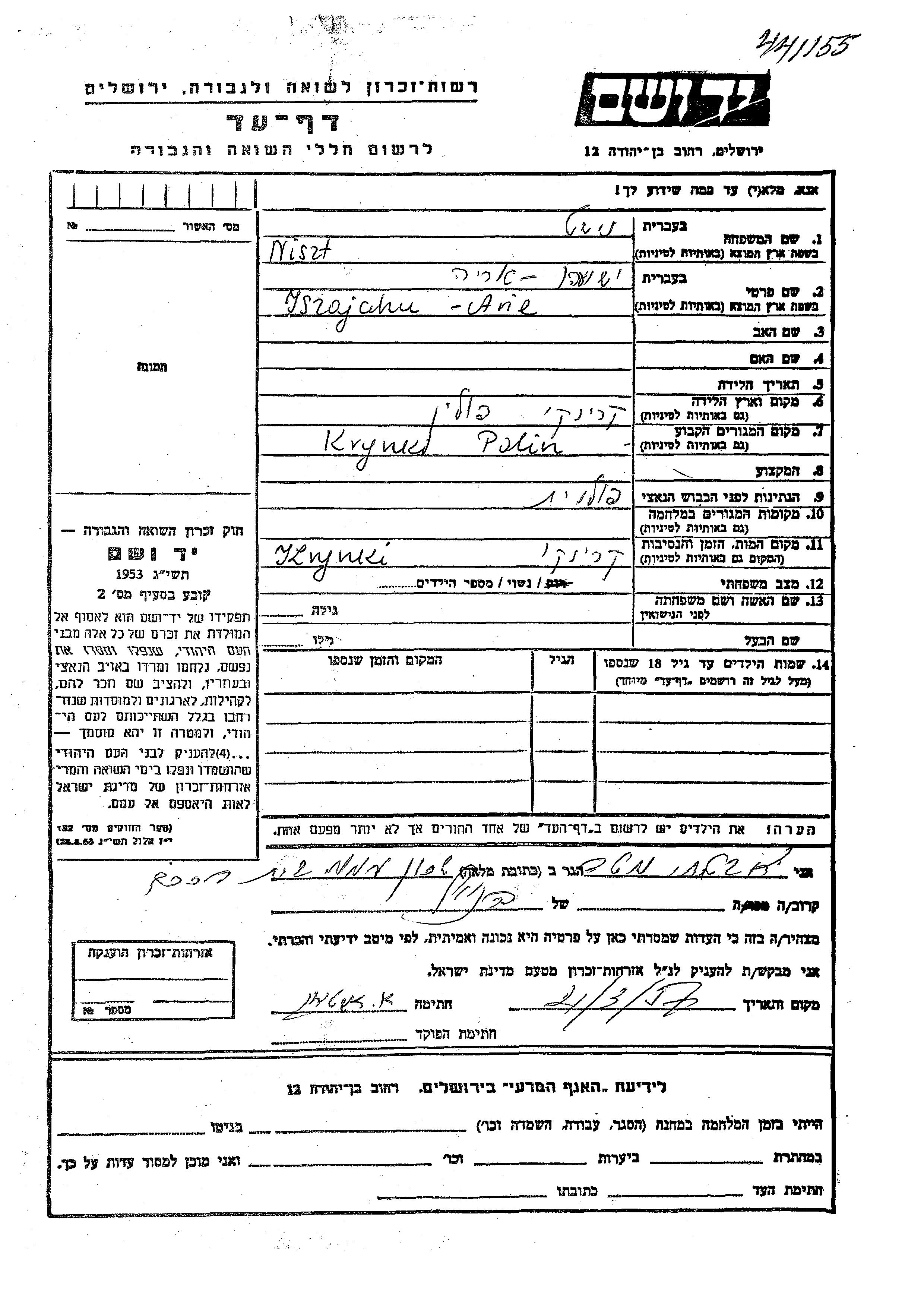 חיפוש שם מוסר דף העד. חיפוש לפי כל שם פרטי, כולל כינוי או שם חיבה