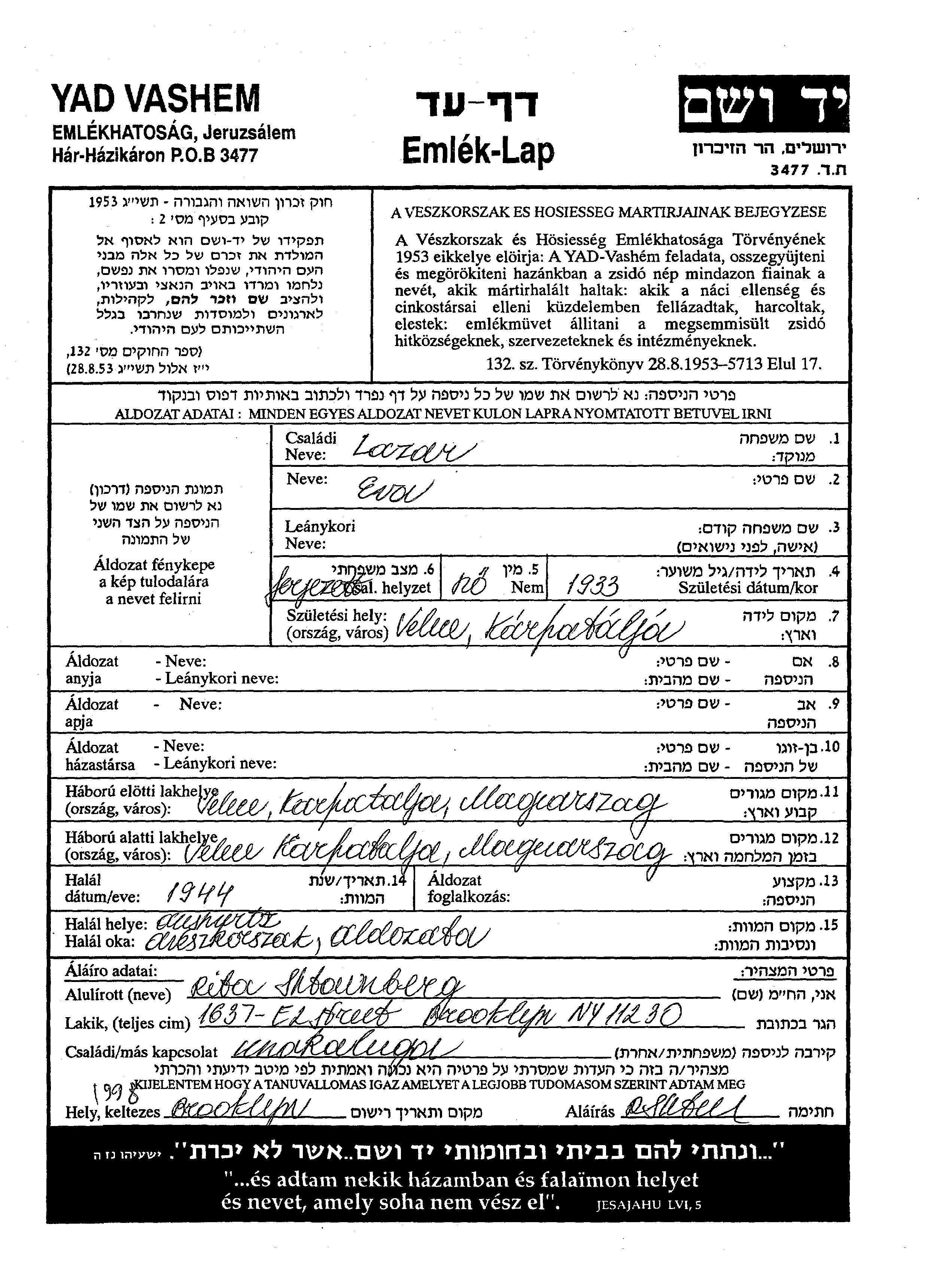 אווה נרצחה בשואה. מקום המוות: Auschwitz שבפולין בשנת 1944.