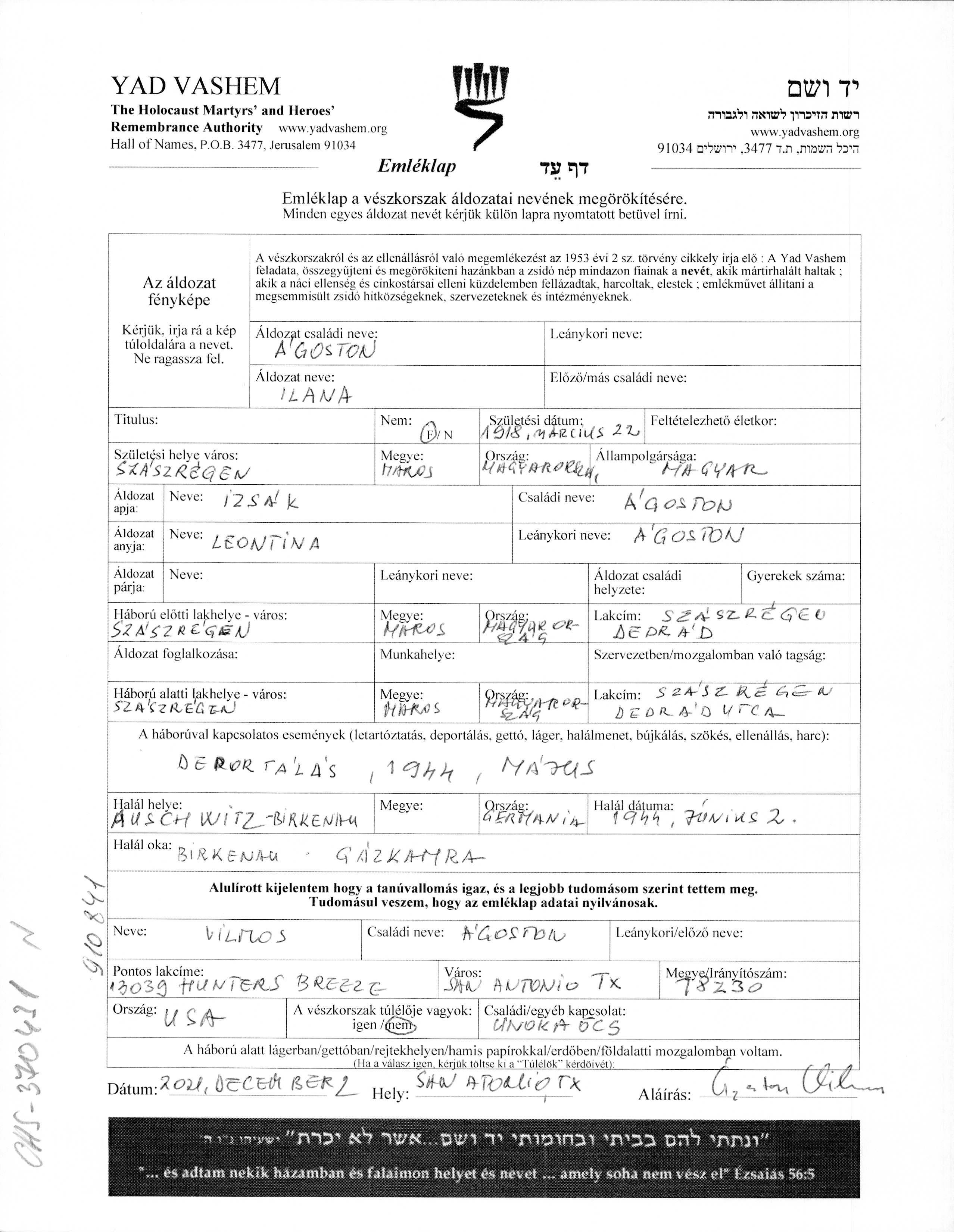 Ilana Ágoston נולדה בSzaszregen שברומניה בשנת 1918. לפני מלחמת העולם השניה התגוררה בSzaszregen שברומניה.
