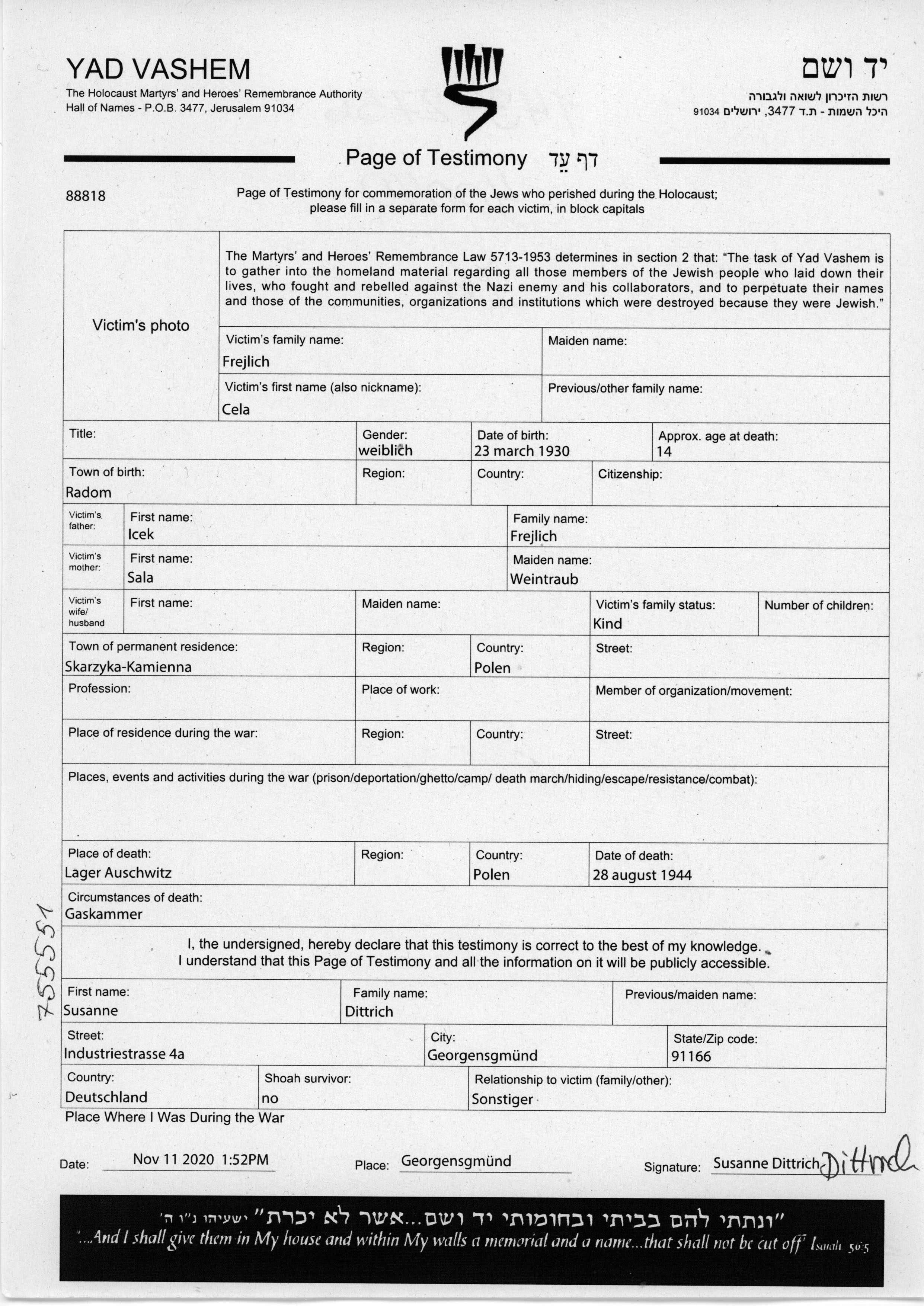 | Frejlich | Cela | 1930 | Skarzysko Kamienna, פולין | דף-עד (מקוון חתום) |
