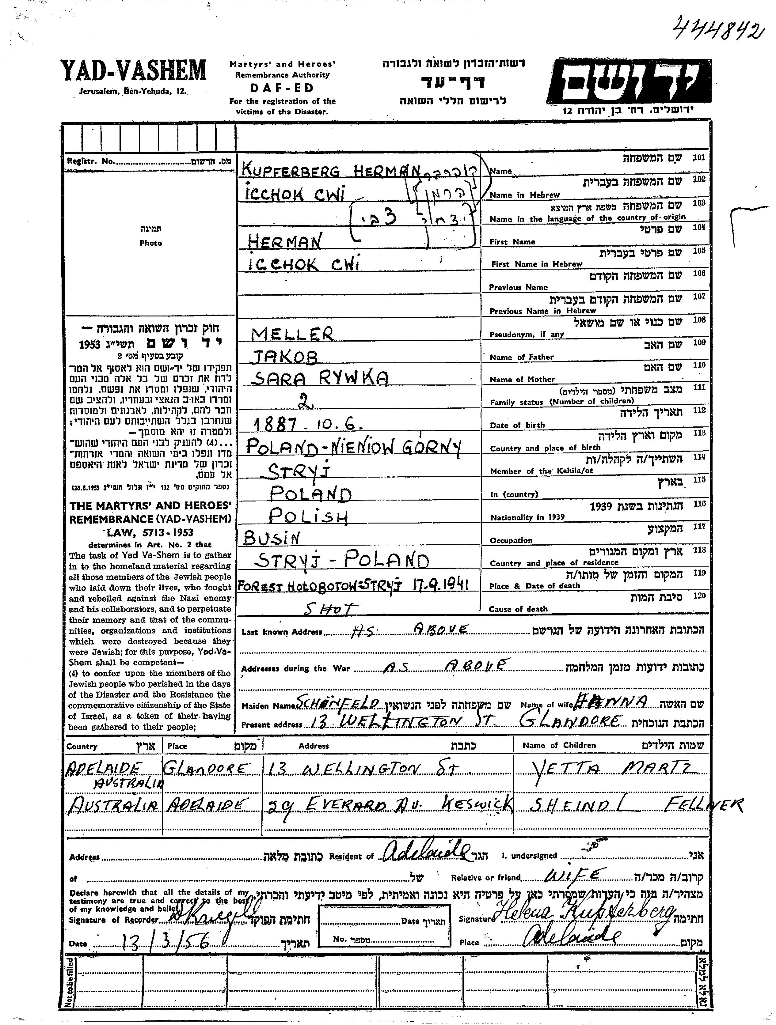 Yetta Sheindl Martzi Kupferberg הרמן. לפני מלחמת העולם השניה התגוררה בStryj שבפולין.