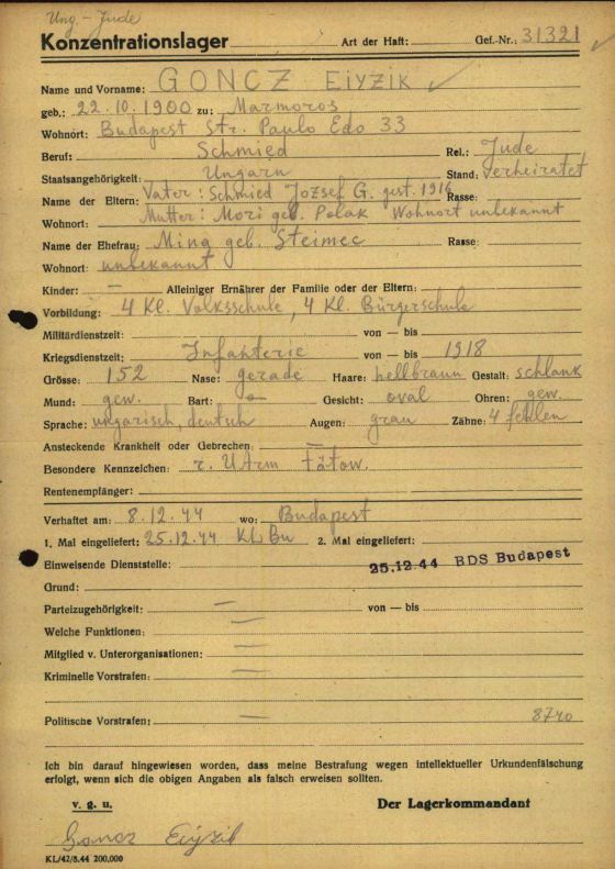 Eizig Gonz נולד בMarmoros שברומניה בשנת 1900. הוא היה נפח. לפני מלחמת העולם השניה התגורר בBudapest שבהונגריה.