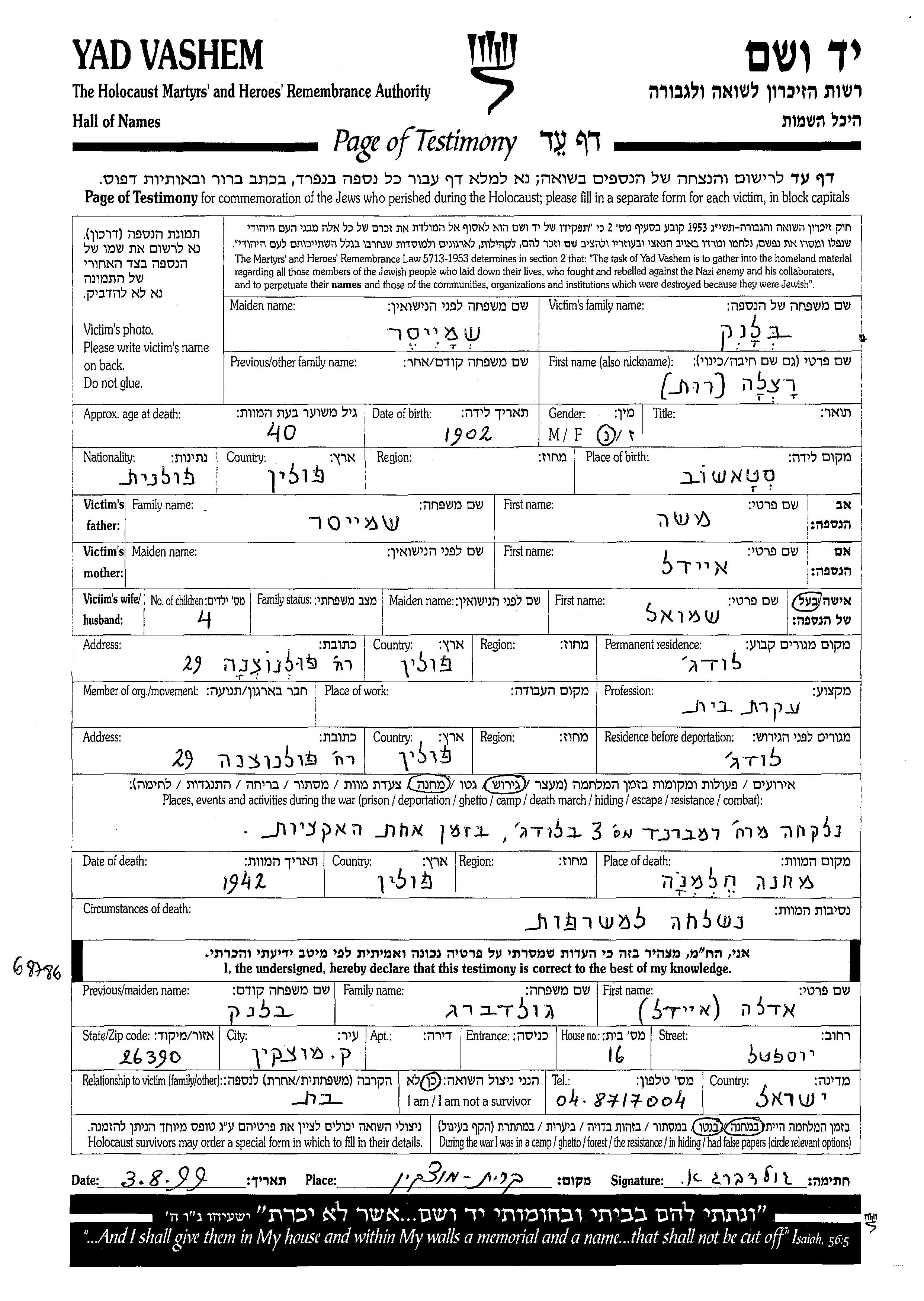 בלנק | רצלה | 1902 | Lodz, פולין | דף-עד |
