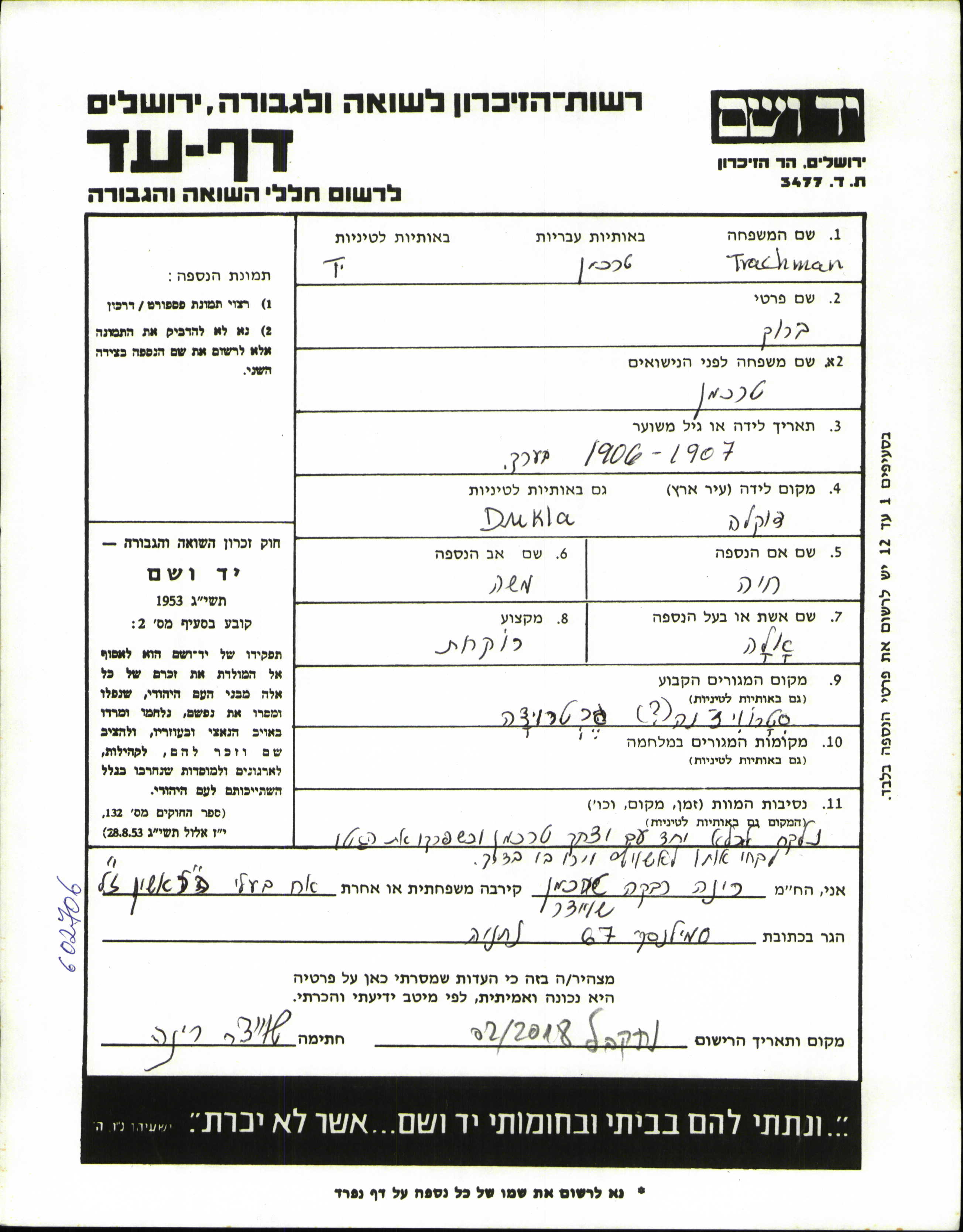 ברוך Trachman Trechman נולד בפולין בשנת 1907. הוא היה סוחר. לפני מלחמת העולם השניה התגורר בKrakow שבפולין.