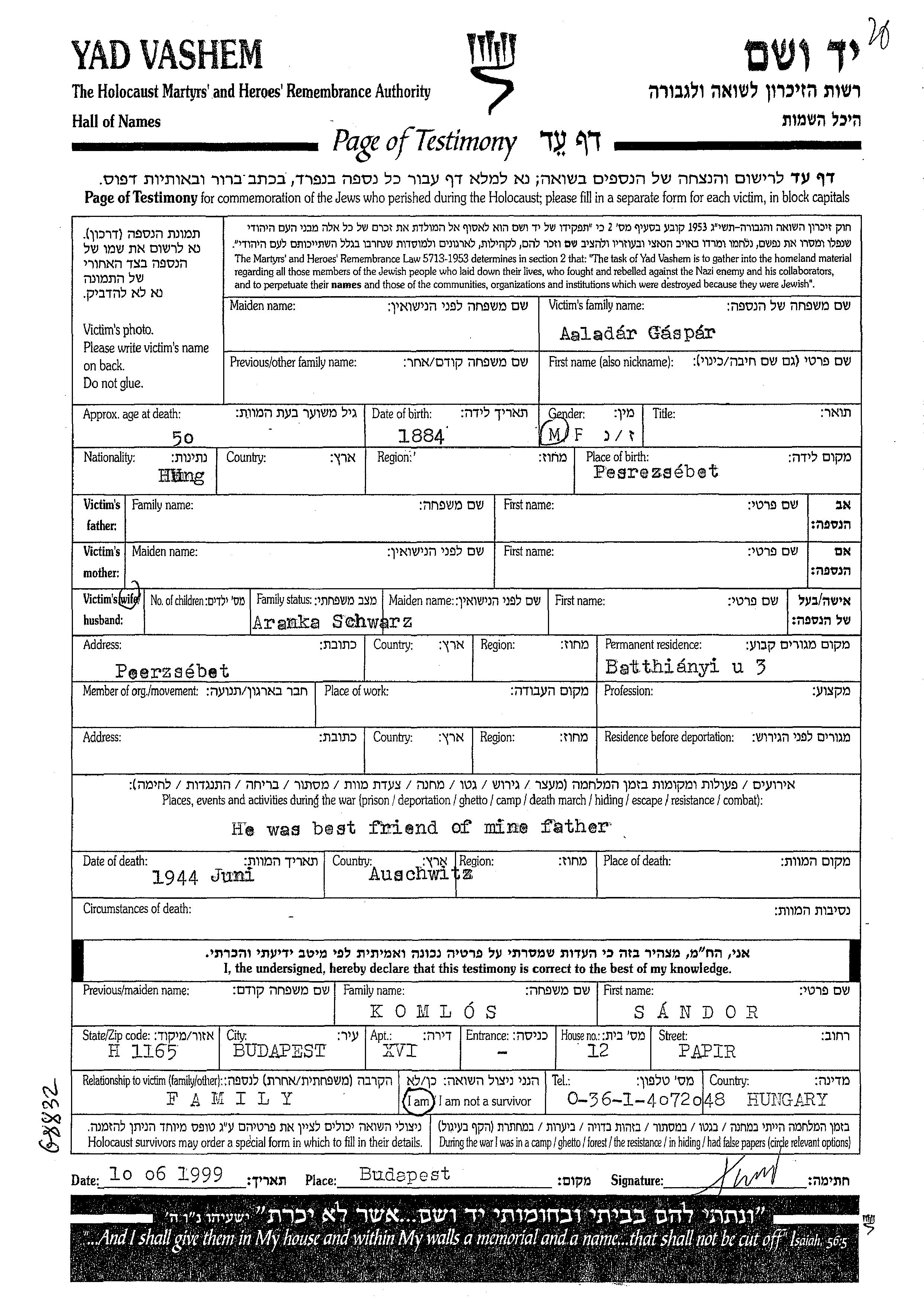 Aaladar Gaspar נולד בPesterzsebet שבהונגריה בשנת 1884. לפני מלחמת העולם השניה התגורר בPesterzsebet שבהונגריה.