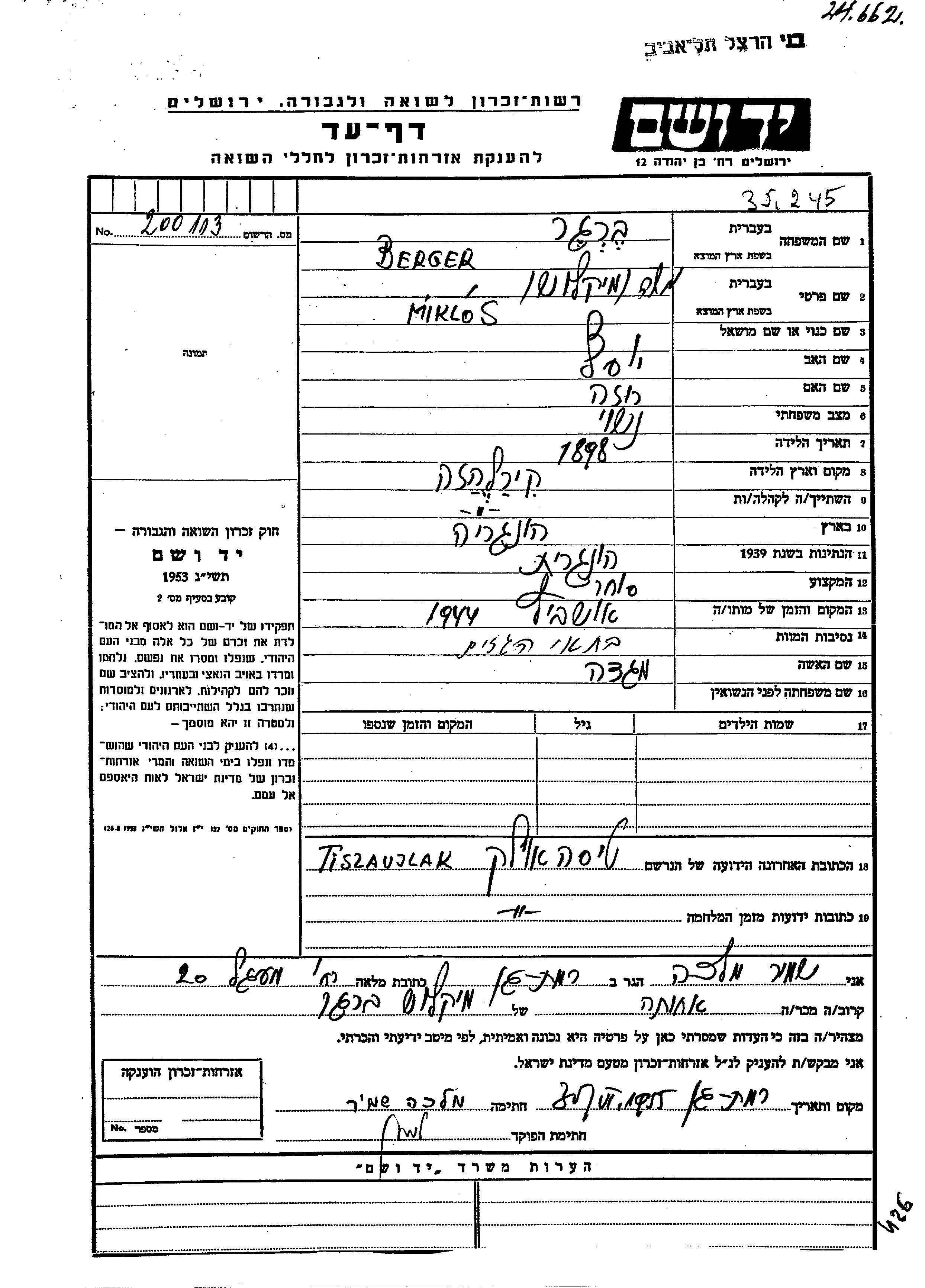 ברגר Miklos משה 1898 Tiszaujlak, צ'כוסלובקיה דף-עד