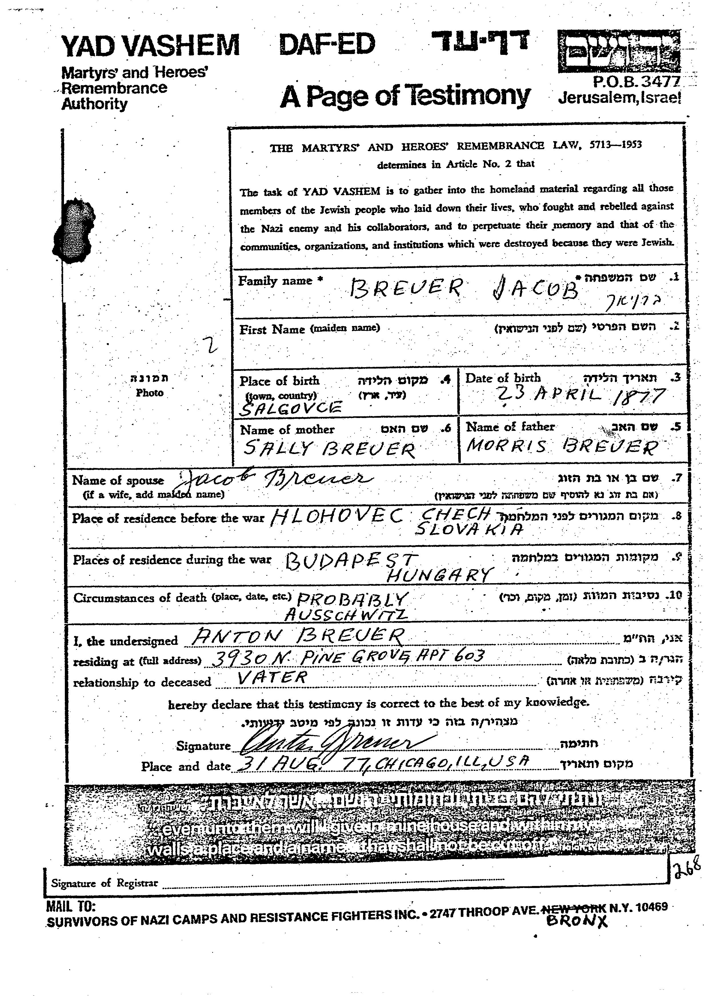 Jacob Breuer ברואר נולד בSalgovce שבצ'כוסלובקיה בשנת 1877. לפני מלחמת העולם השניה התגורר בHlohovec שבצ'כוסלובקיה.