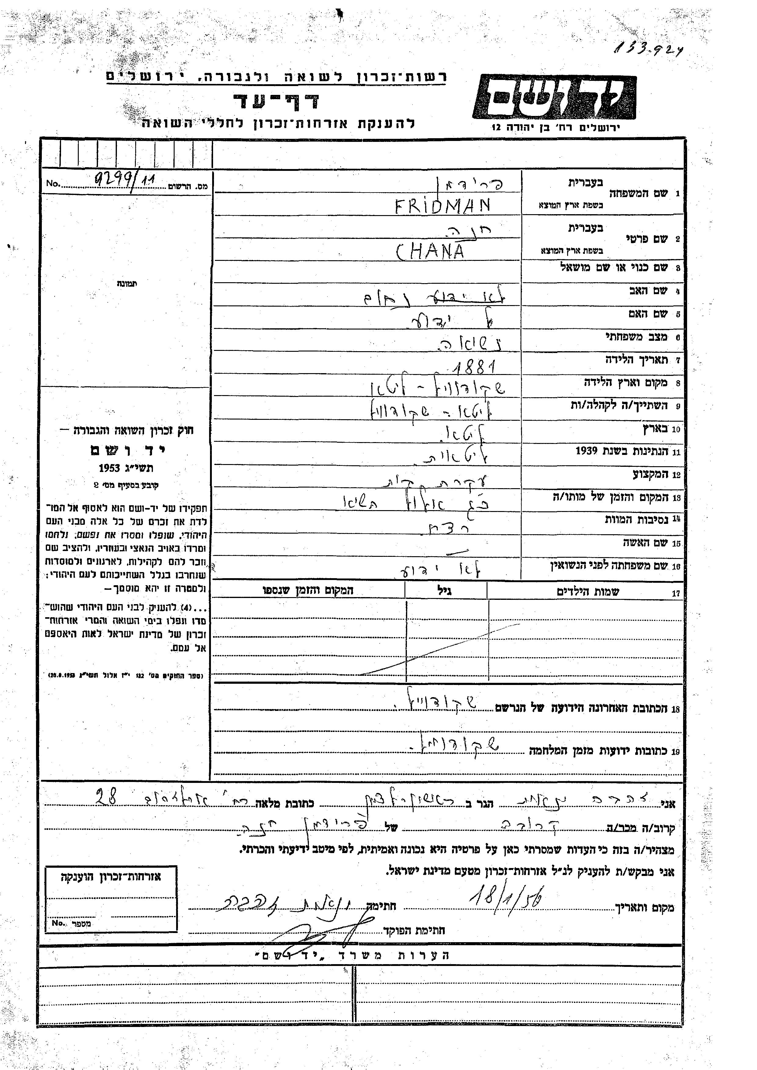 חנה פרידמן נולדה בSkodvil שבליטא בשנת 1881 לנחום. היא היתה עקרת בית ונשואה. לפני מלחמת העולם השניה התגוררה בSkodvil שבליטא. בזמן המלחמה היא היתה בSkodvil שבליטא. חנה נרצחה בשואה. מקום המוות: לא ידוע בשנת 1941.
