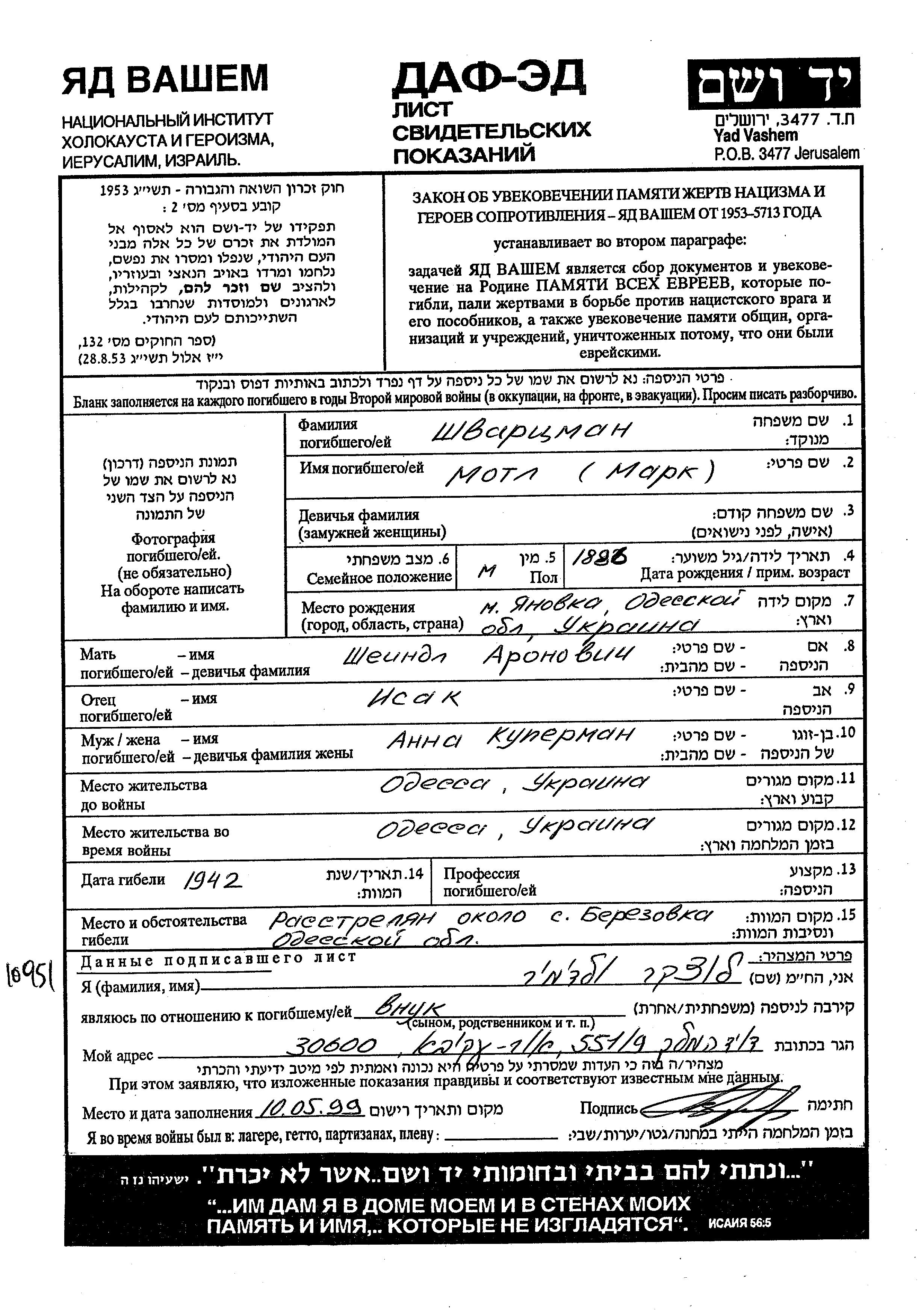 הוא נרצח בשואה. מקום המוות: Berezovka שבאוקראינה (ברה"מ) בשנת 02/1942.