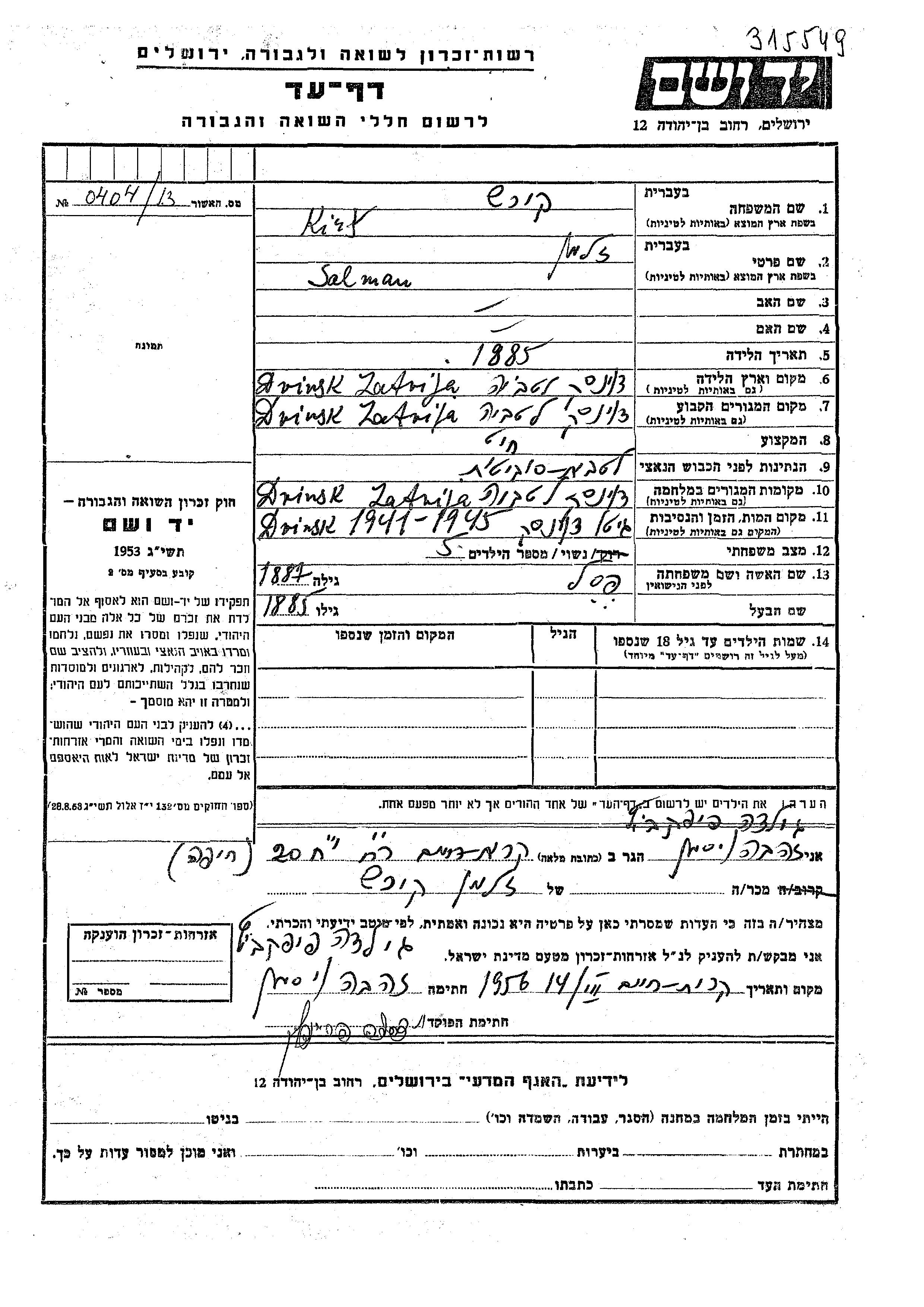 סלמן נרצח בשואה. מקום המוות: Dvinsk שבלטביה בשנת 1941.