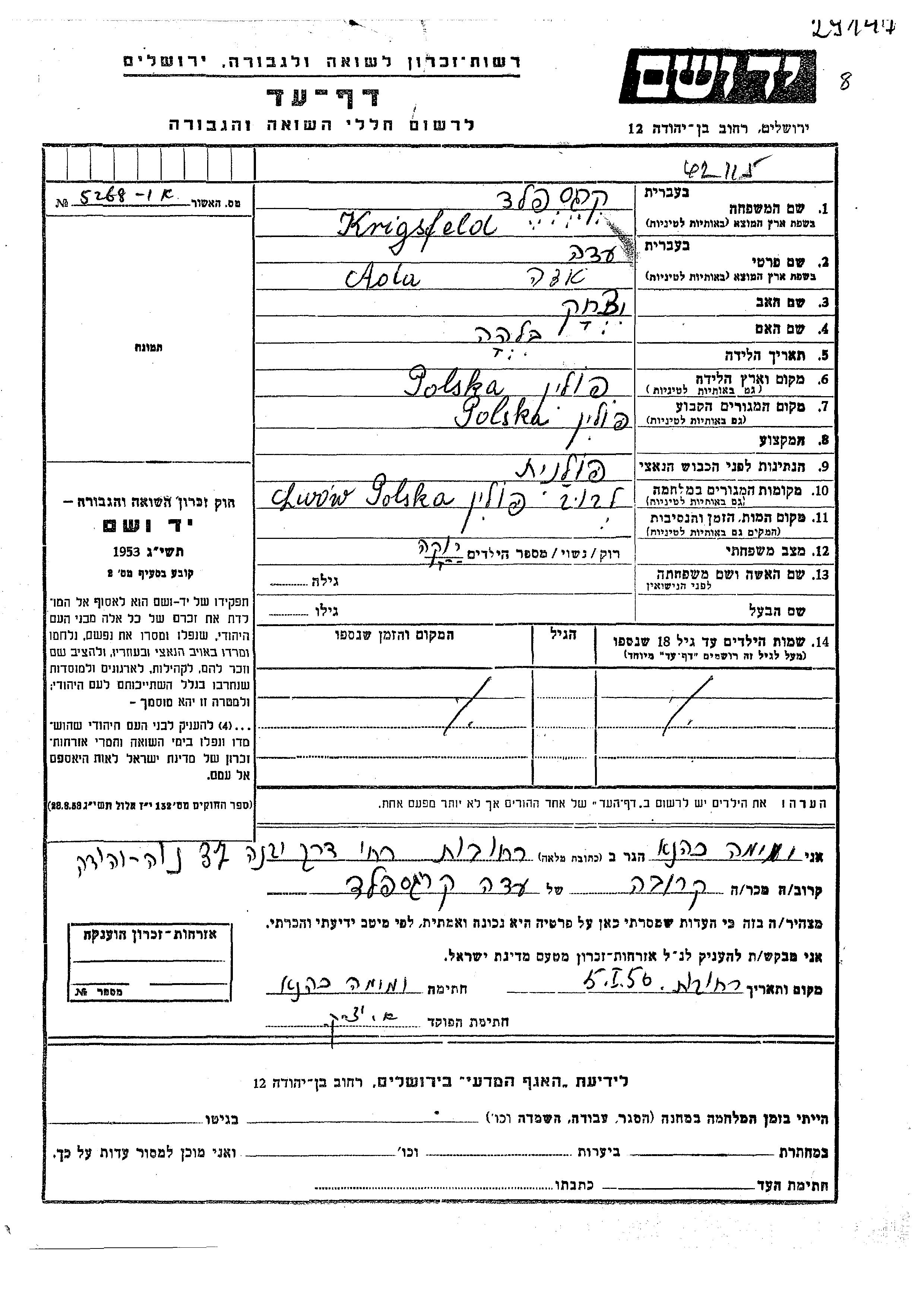 עדה אדה קריגספלד נולדה בפולין ליצחק ובלהה. היא היתה רווקה. לפני מלחמת העולם השניה התגוררה בפולין. בזמן המלחמה היא היתה בLwow שבפולין. עדה אדה נרצחה בשואה.