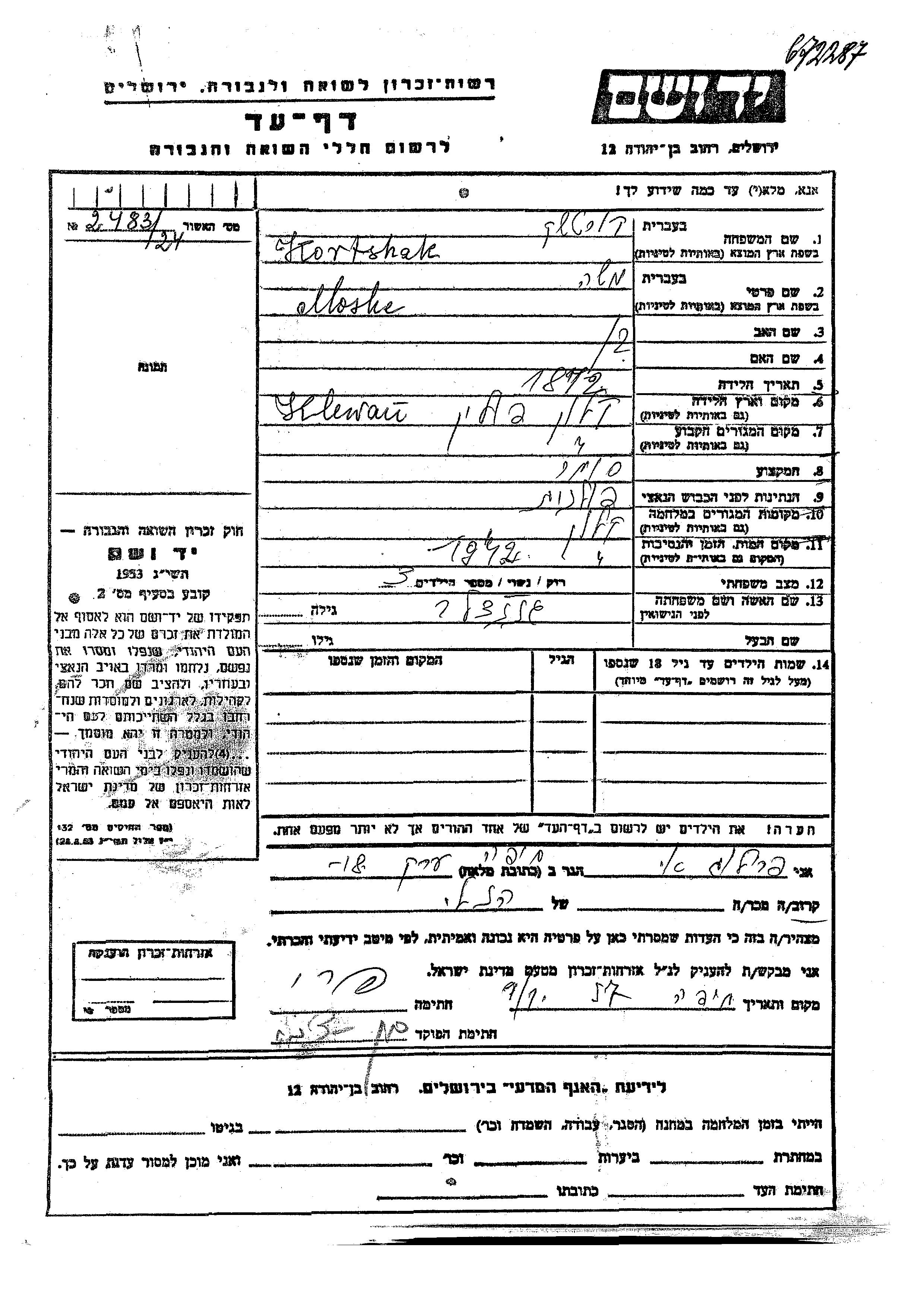 משה Kortshak נולד בKlewań שבפולין בשנת 1872. הוא היה סוחר ונשוי לגננדל. לפני מלחמת העולם השניה התגורר בKlewań שבפולין. בזמן המלחמה הוא היה בKlewań שבפולין. משה נרצח בשואה. מקום המוות: Klewań שבפולין בשנת 1942.