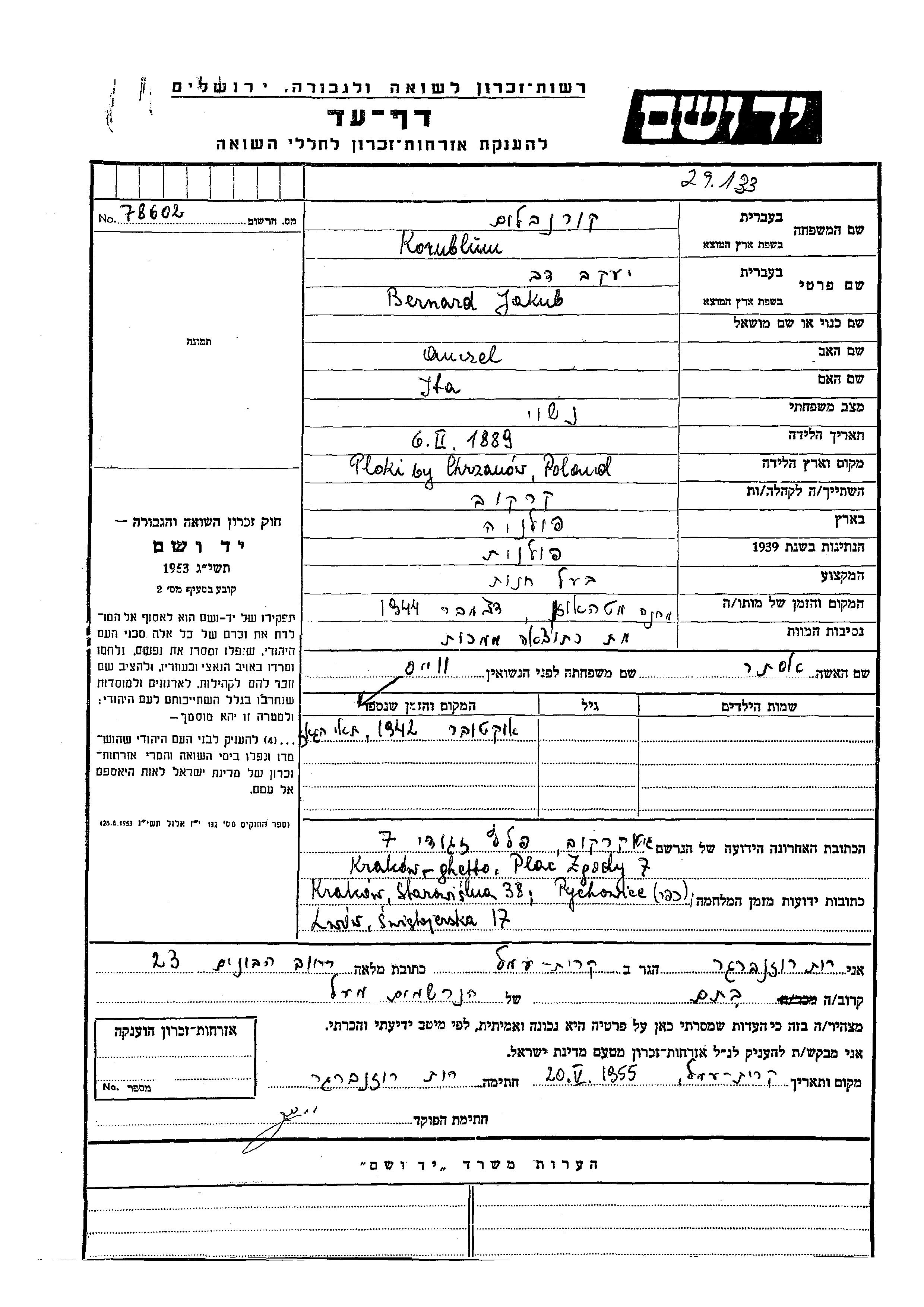 ברנרד Jakub דב קורנבלום נולד בPloki שבפולין בשנת 1889 לAnczel ואיטה. הוא היה בעל חנות ונשוי לאסתר לבית ווייס. לפני מלחמת העולם השניה התגורר בKrakow שבפולין. בזמן המלחמה הוא היה בLwow שבפולין. ברנרד Jakub דב נרצח בשואה. מקום המוות: Mauthausen שבאוסטריה בשנת 1944.