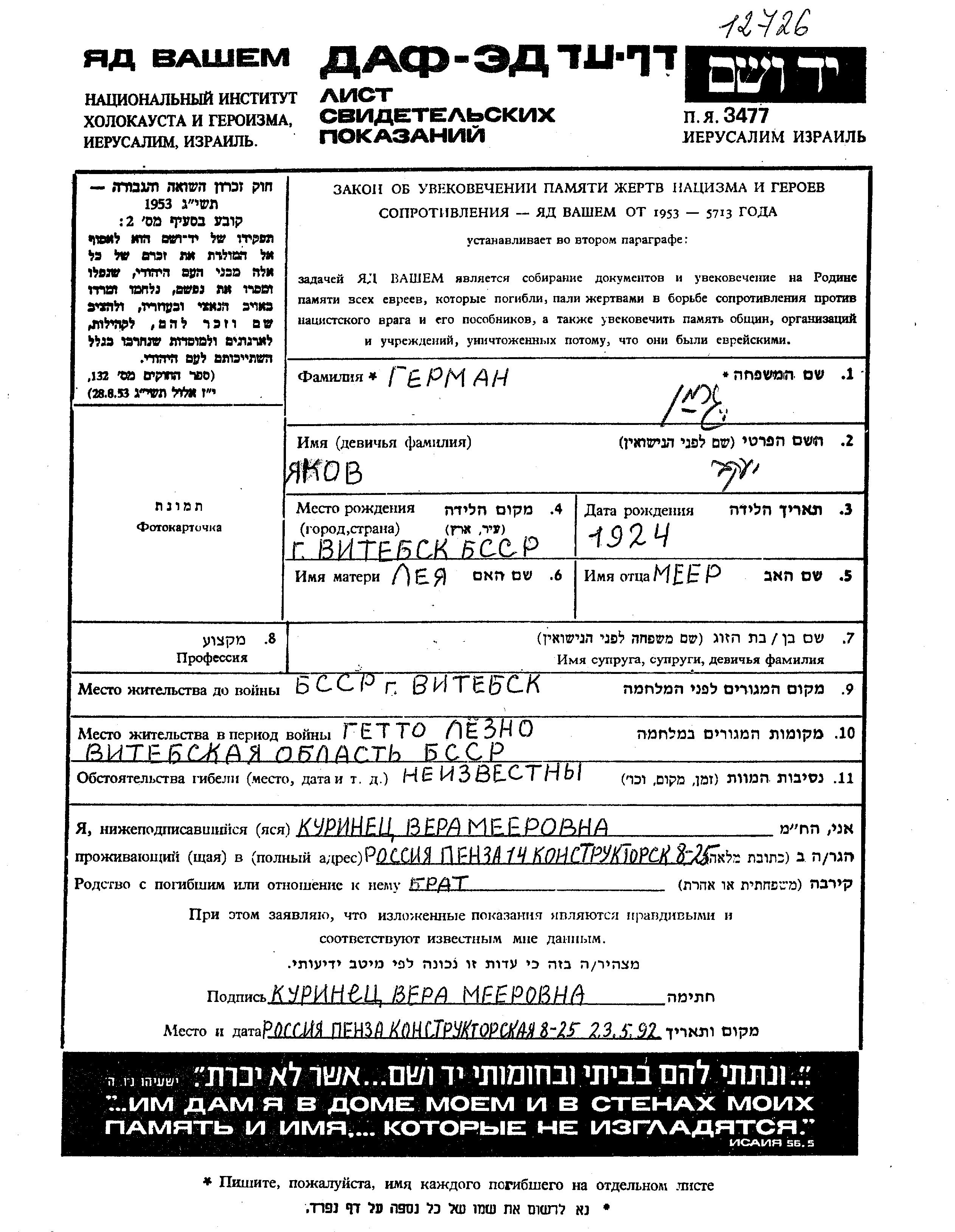 Yakov גרמן נולד בVitebsk שבביאלורוסיה (ברה"מ) בשנת 1924. לפני מלחמת העולם השניה התגורר בVitebsk שבביאלורוסיה (ברה"מ).