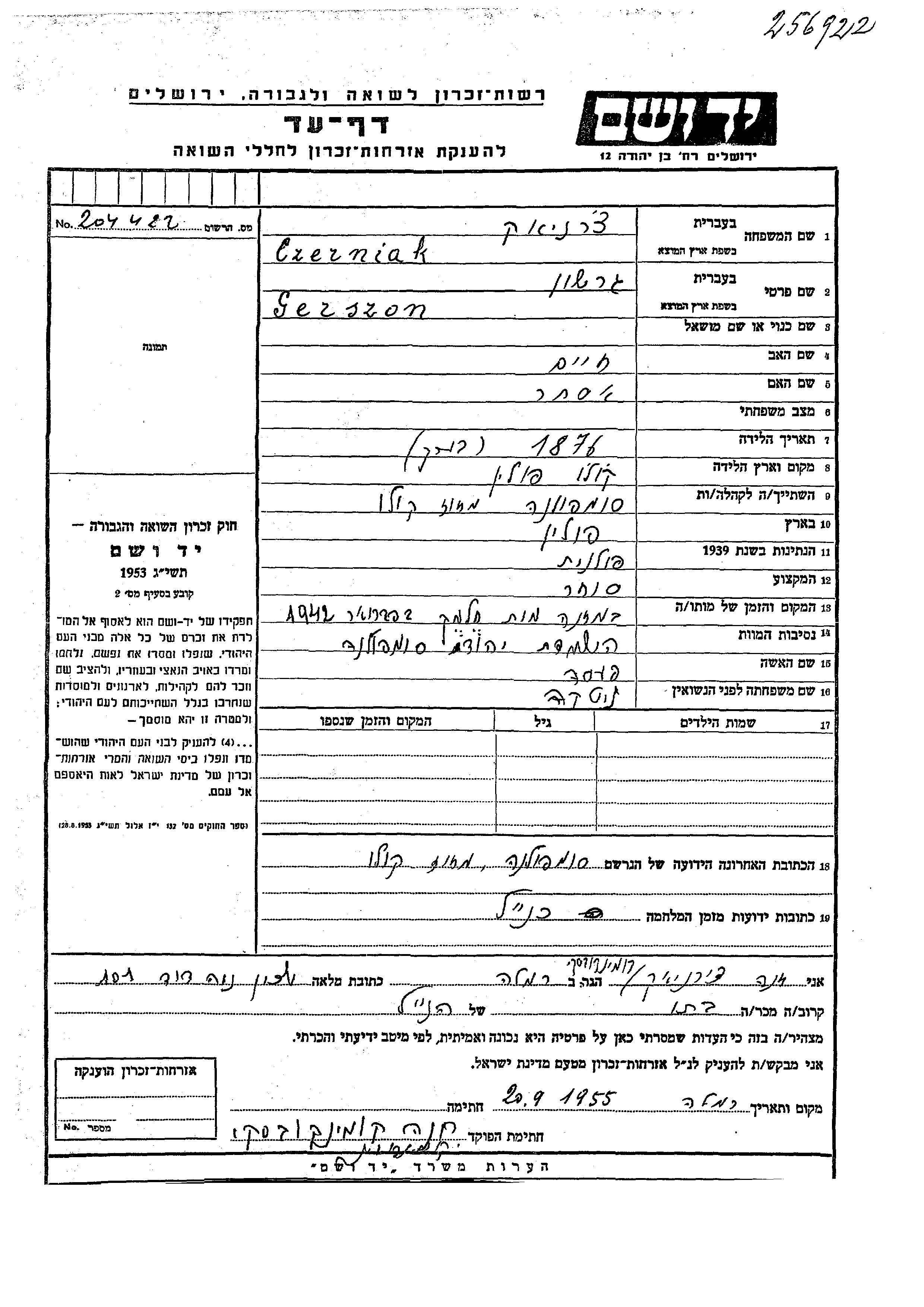 Czerniak Gerszon 1876 Sompolna, פולין דף-עד
