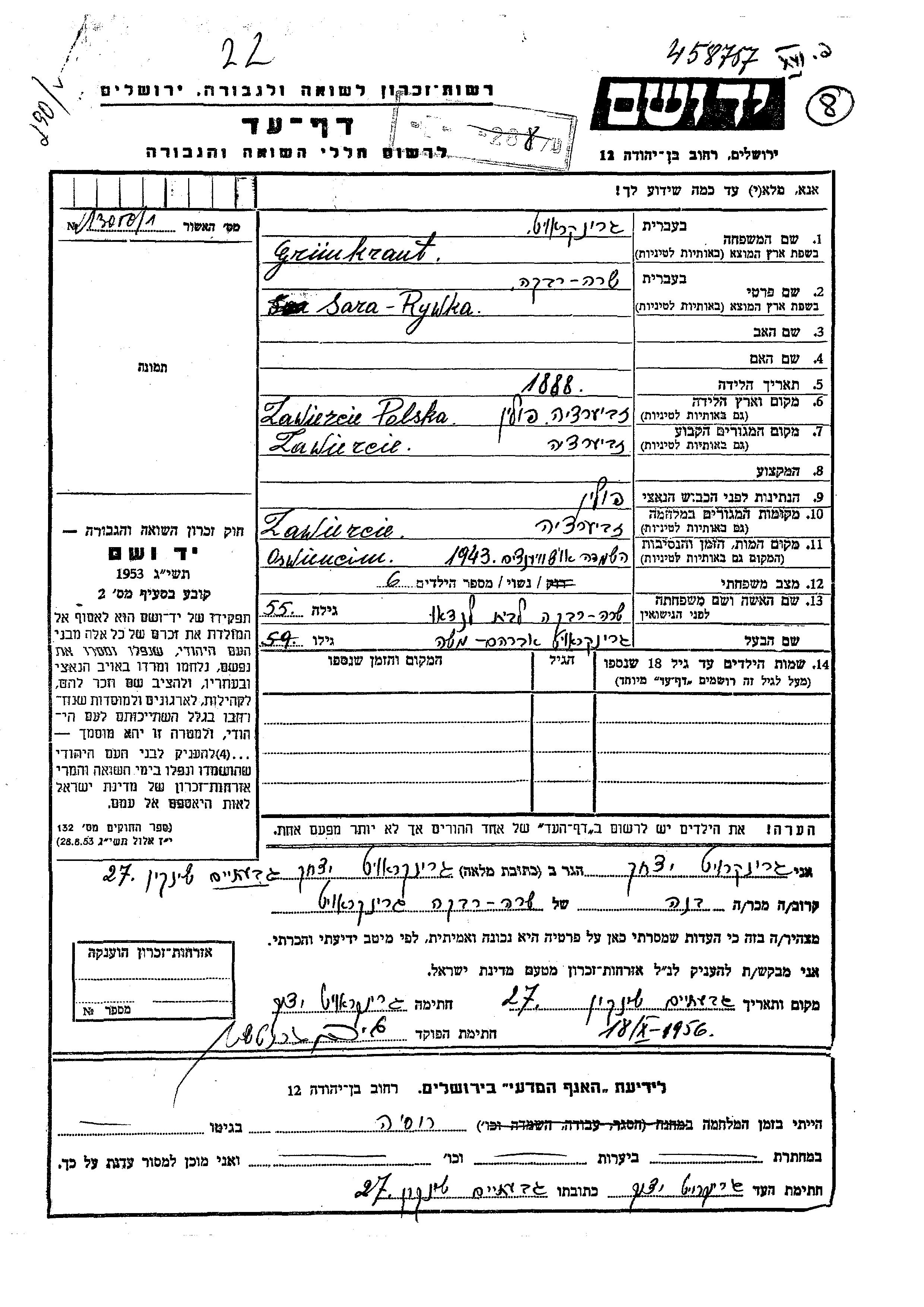 Rywka שרה Gruenkraut לבית לנדאו נולדה בZawiercie שבפולין בשנת 1888. היא היתה נשואה לאברהם משה. לפני מלחמת העולם השניה התגוררה בZawiercie שבפולין. בזמן המלחמה היא היתה בZawiercie שבפולין. היא נרצחה בשואה. מקום המוות: Auschwitz שבפולין בשנת 1943.