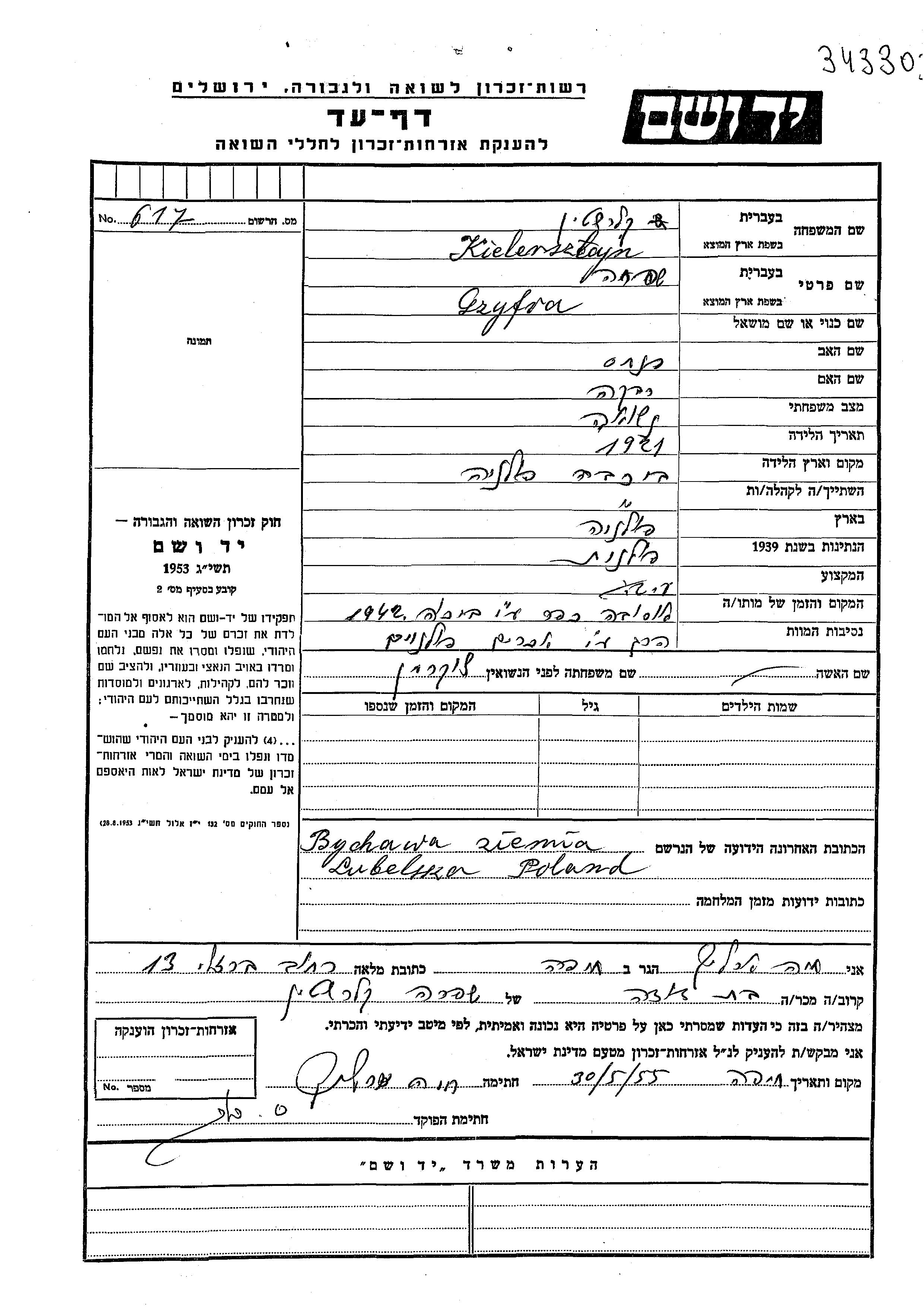 Szyfra Kielersztajn לבית לוקרמן נולדה בBychawa שבפולין בשנת 1921 לפנחס ורבקה. היא היתה עקרת בית ונשואה. לפני מלחמת העולם השניה התגוררה בBychawa שבפולין. בזמן המלחמה היא היתה בBychawa שבפולין. היא נרצחה בשואה. מקום המוות: Ossowa שבפולין בשנת 1942.