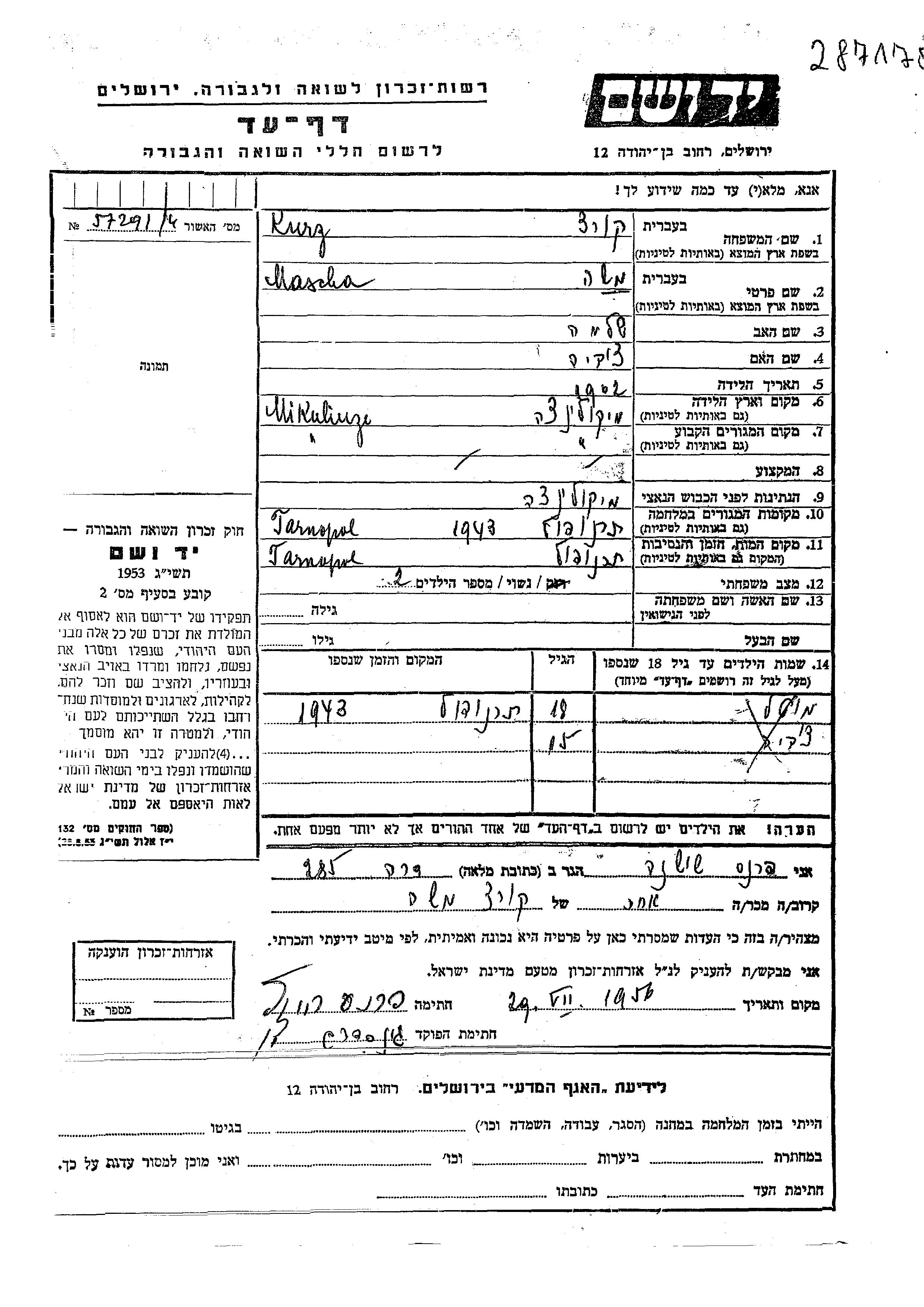 Mascha Kurz נולדה בMikulincie שבפולין בשנת 1902 לשלמה וציביה. היא היתה נשואה. לפני מלחמת העולם השניה התגוררה בMikulincie שבפולין. בזמן המלחמה היא היתה בTarnopol שבפולין. היא נרצחה בשואה. מקום המוות: Tarnopol שבפולין בשנת 1943.