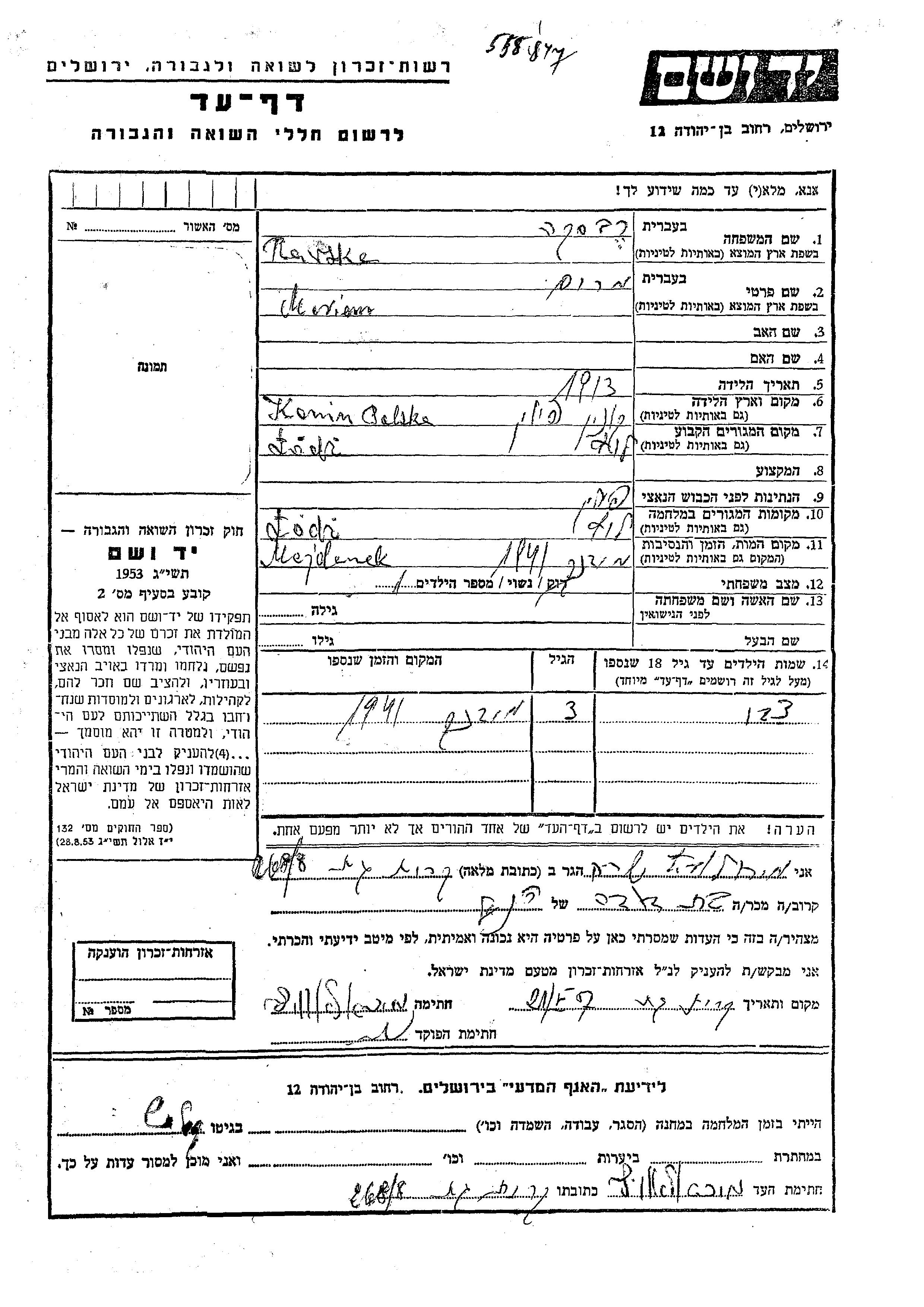 מרים נרצחה בשואה. מקום המוות: Majdanek שבפולין בשנת 1941.