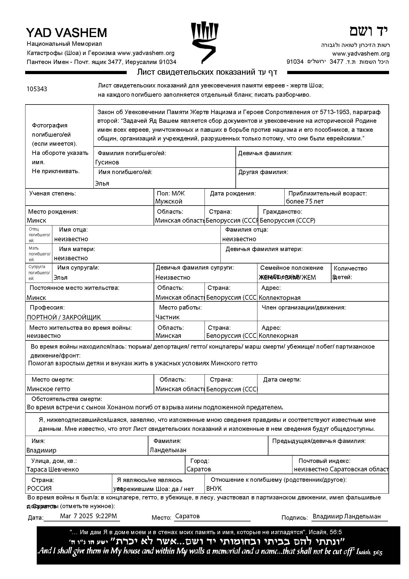 Eliya Gusinov נולד בMinsk שבביאלורוסיה (ברה"מ) לשם פרטי לא ידוע ושם פרטי לא ידוע. הוא היה חייט ונשוי. לפני מלחמת העולם השניה התגורר בMinsk שבביאלורוסיה (ברה"מ). בזמן המלחמה הוא היה בMinsk שבביאלורוסיה (ברה"מ). הוא נרצח בשואה. מקום המוות: Minsk שבביאלורוסיה (ברה"מ).