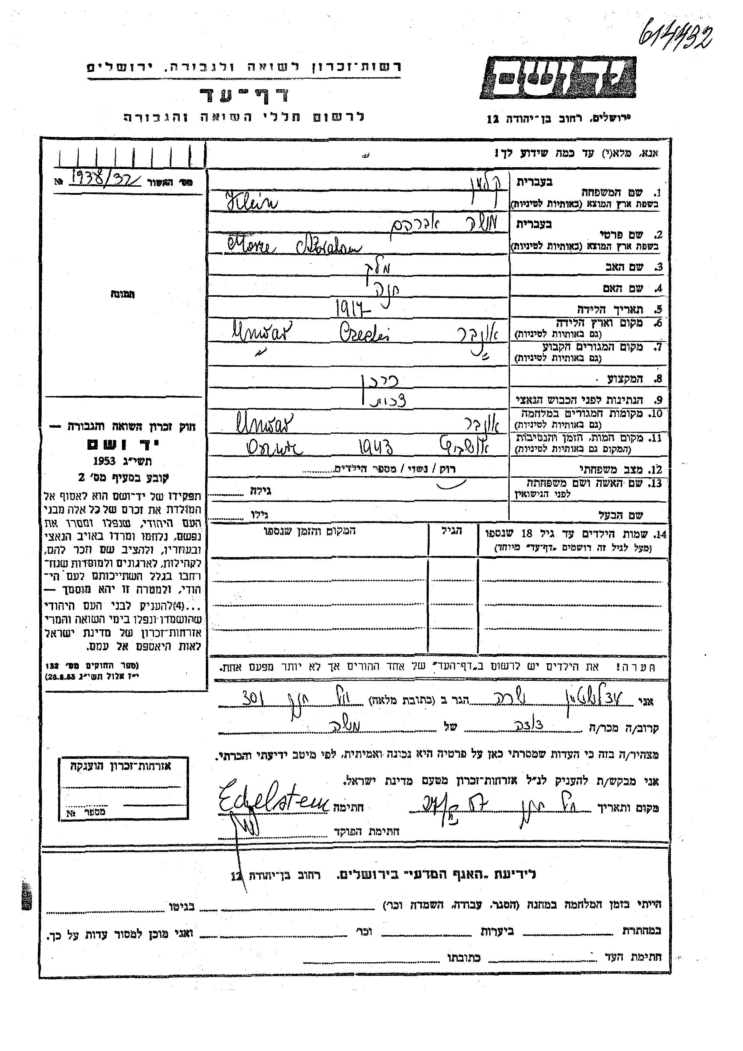 קליין Mosze Abraham 1917 Ungwar, צ'כוסלובקיה דף-עד