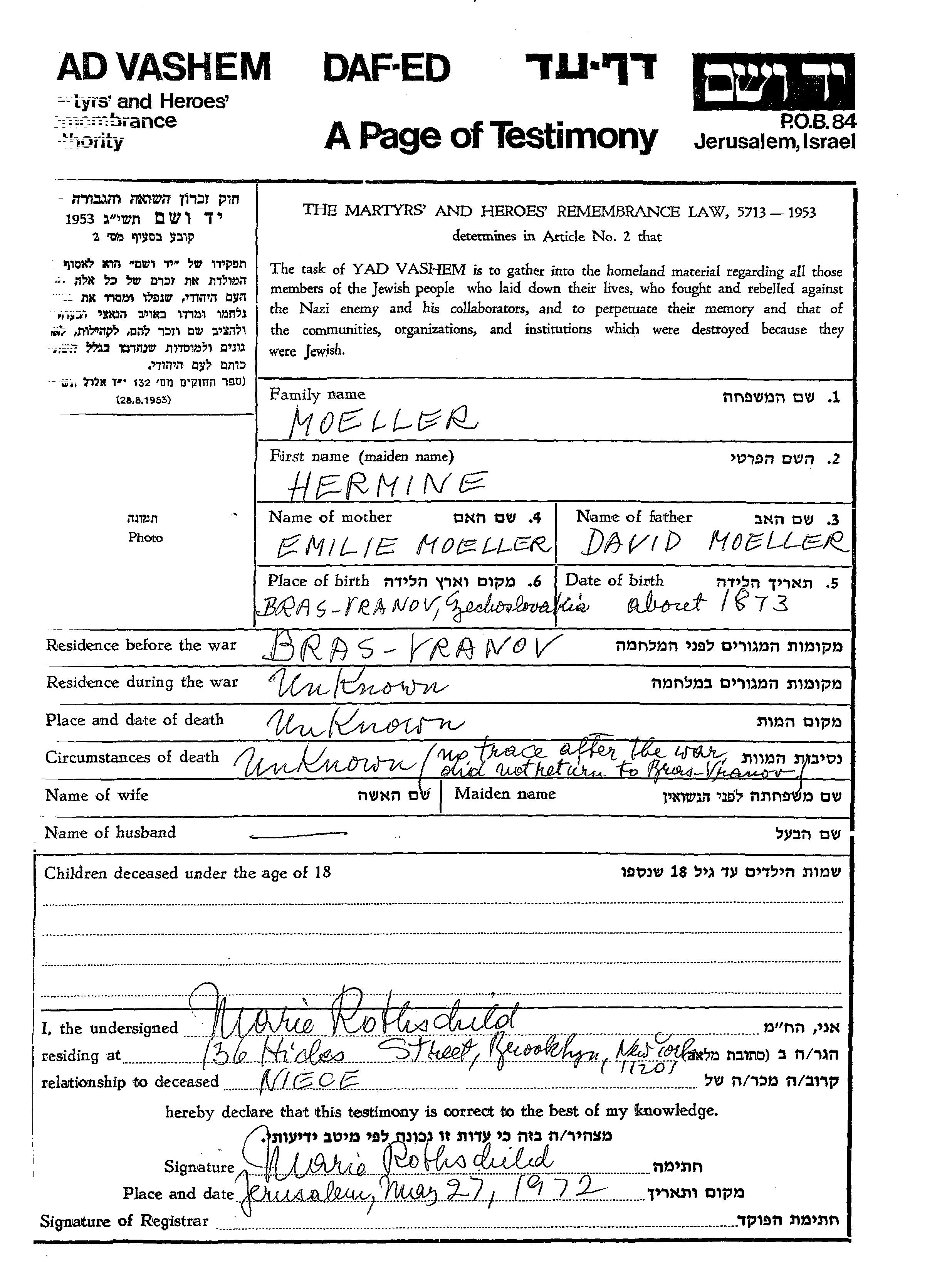 Hermine Moeller נולדה בBras שבצ'כוסלובקיה בשנת 1873 לדוד וEmilie. לפני מלחמת העולם השניה התגוררה בBras שבצ'כוסלובקיה.