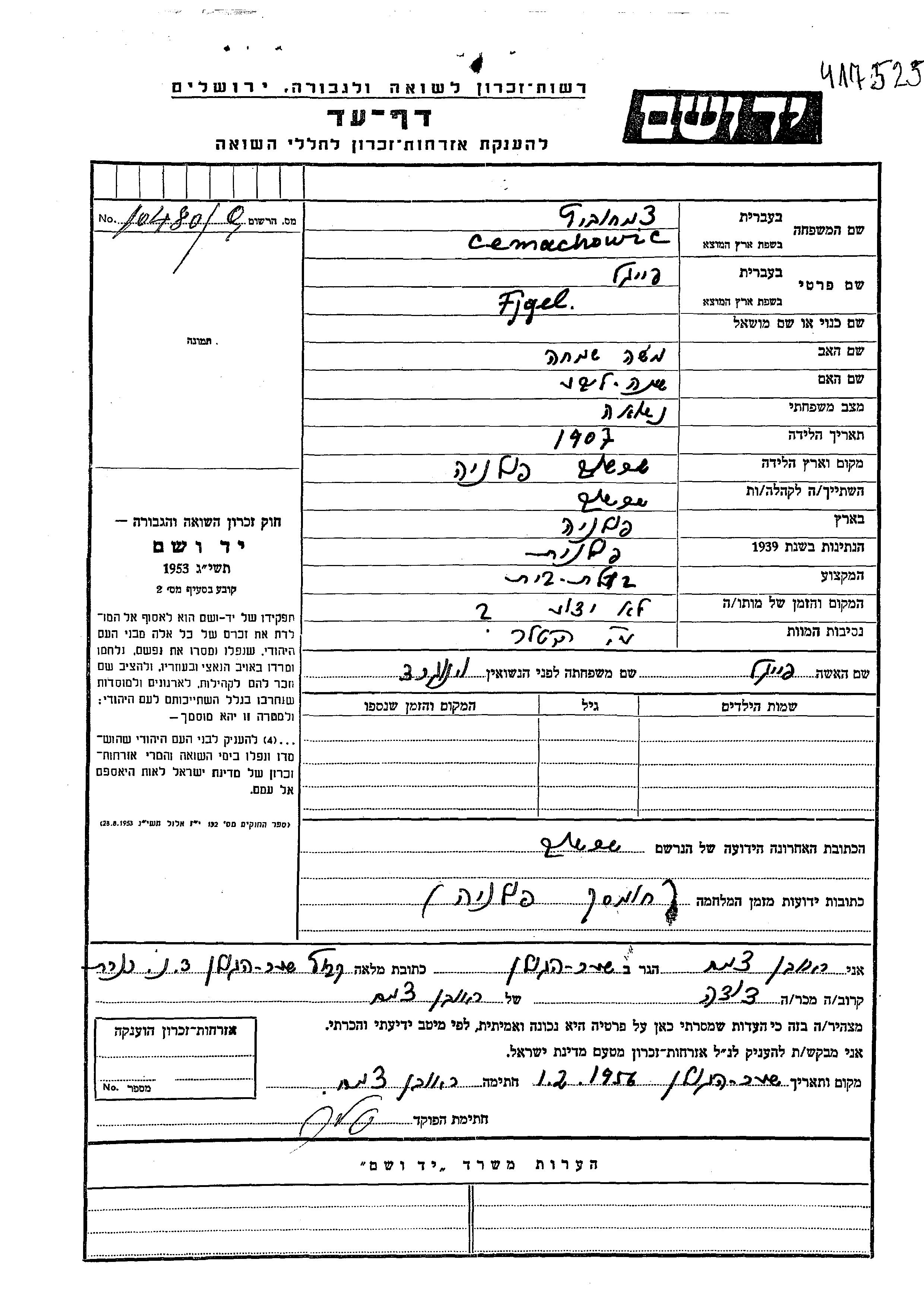 Fjgel Cemachowic לבית וינוגרד נולדה בSzereszow שבפולין בשנת 1907 למשה שמחה ושינה ליבע. היא היתה עקרת בית ונשואה לפייגל. לפני מלחמת העולם השניה התגוררה בSzereszow שבפולין. בזמן המלחמה היא היתה בChomsk שבפולין. היא נרצחה בשואה.