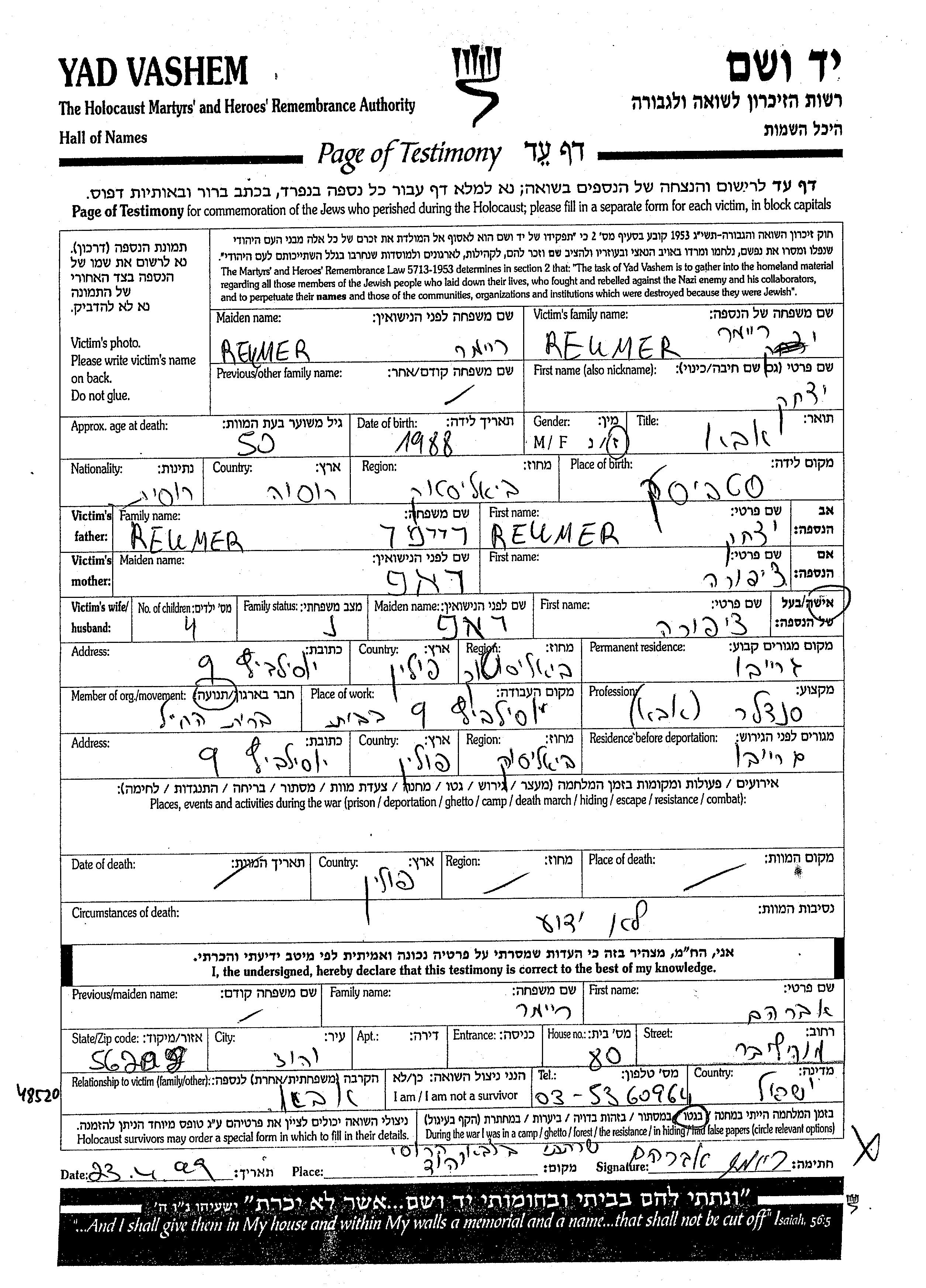 Reumer ריימר יצחק 1888 Grajevo, פולין דף-עד