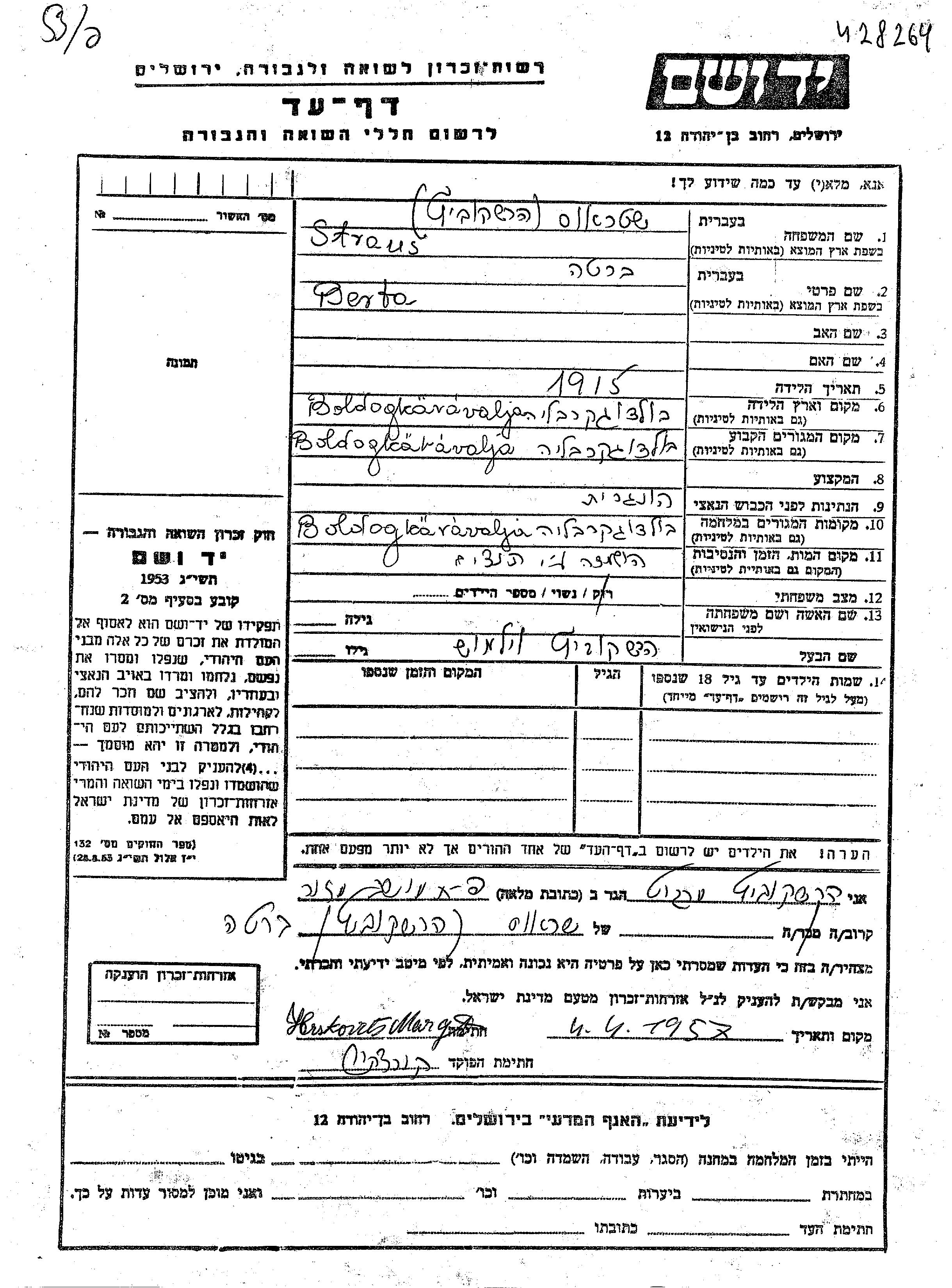 ברטה Straus לבית הרשקוביץ נולדה בBoldogkovaralja שבהונגריה בשנת 1915. היא היתה נשואה לוילמוש קוביץ. לפני מלחמת העולם השניה התגוררה בBoldogkovaralja שבהונגריה. בזמן המלחמה היא היתה בBoldogkovaralja שבהונגריה. ברטה נרצחה בשואה.