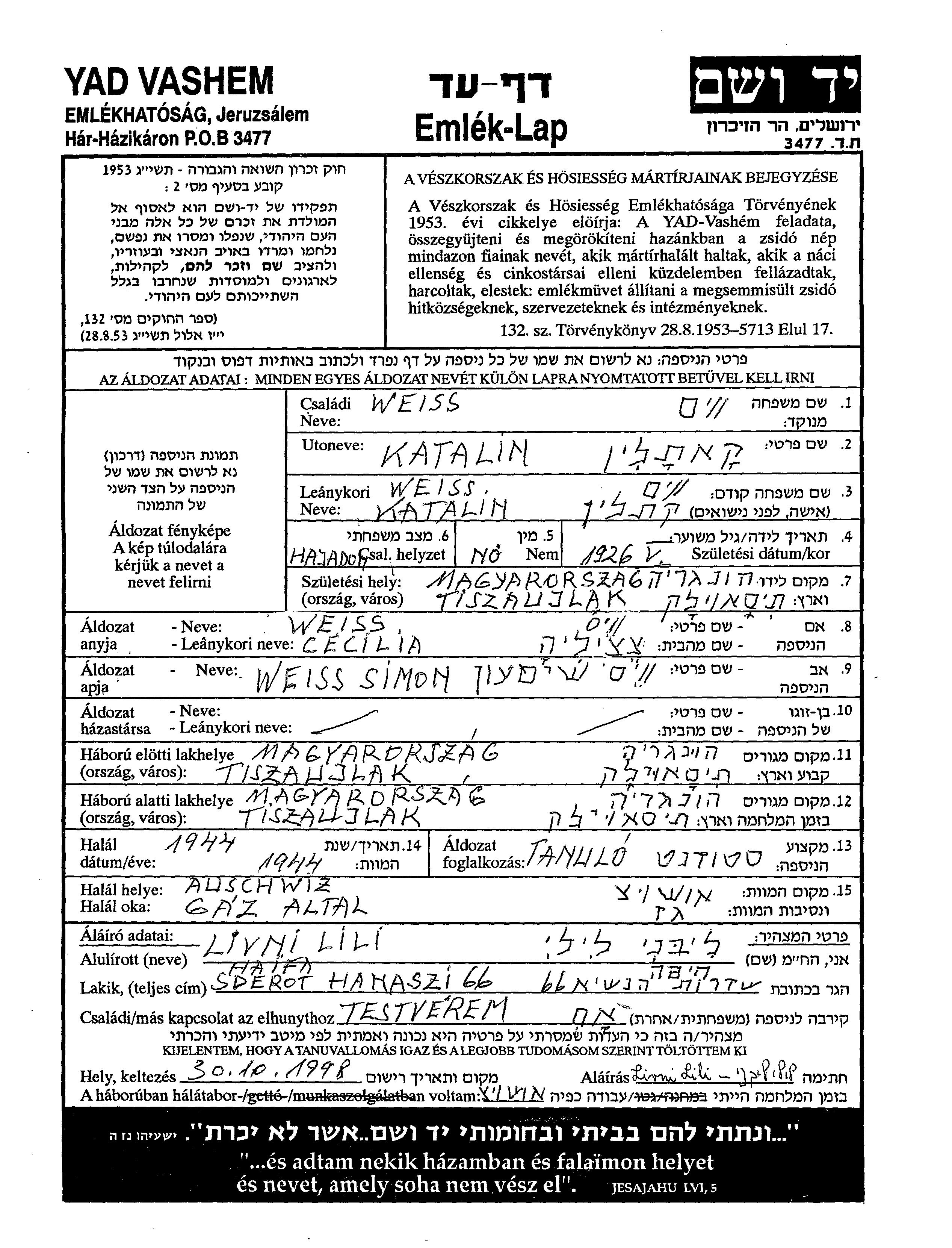 קאתלין Weiss נולדה בTiszaujlak שבצ'כוסלובקיה בשנת 1926 לשימעון וCecilia. היא היתה סטודנטית ורווקה. לפני מלחמת העולם השניה התגוררה בTiszaujlak שבצ'כוסלובקיה. בזמן המלחמה היא היתה בTiszaujlak שבצ'כוסלובקיה. קאתלין נרצחה בשואה. מקום המוות: Auschwitz שבפולין בשנת 1944.