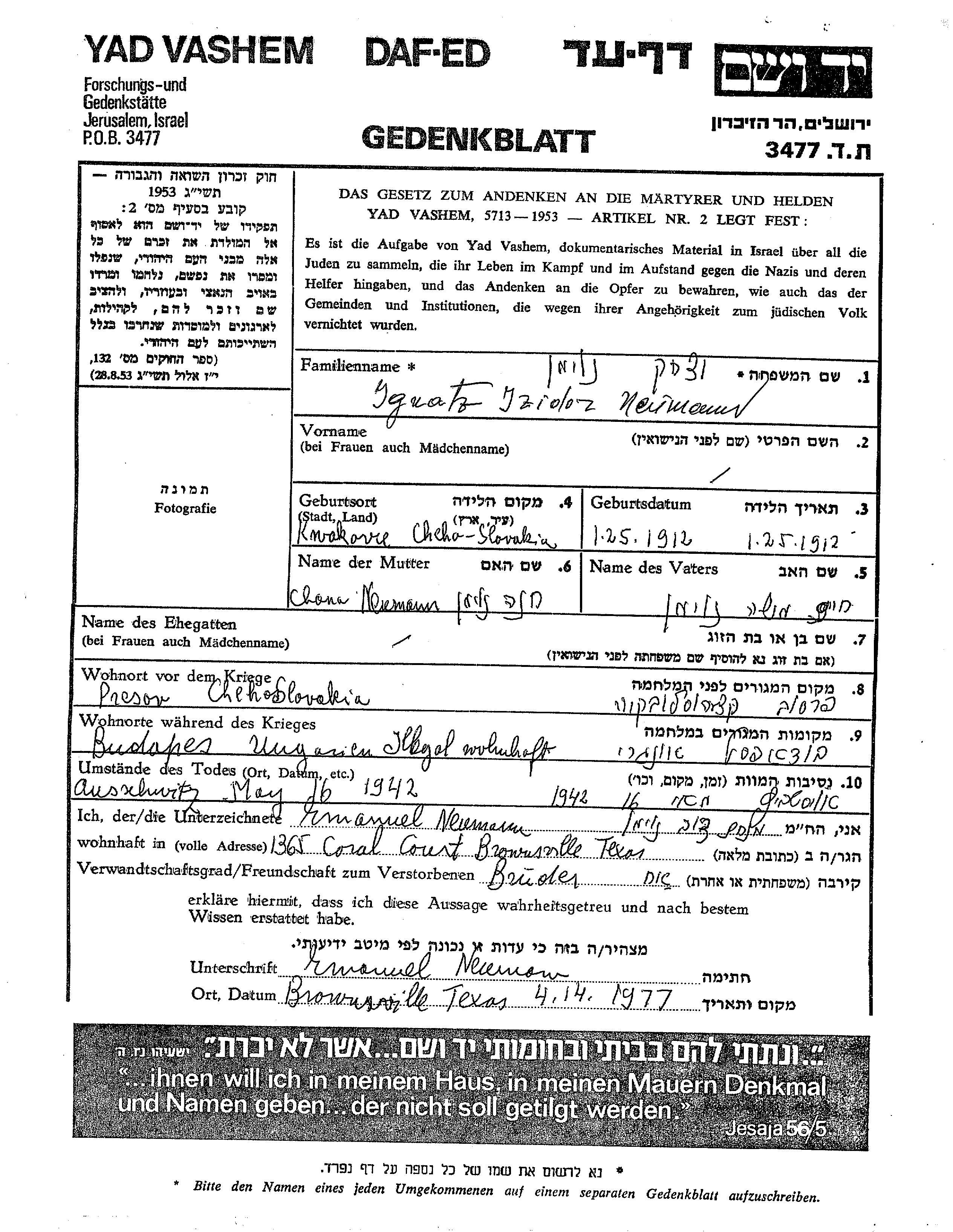 Neumann איגנץ איזידור יצחק 1912 Presov, צ'כוסלובקיה דף-עד