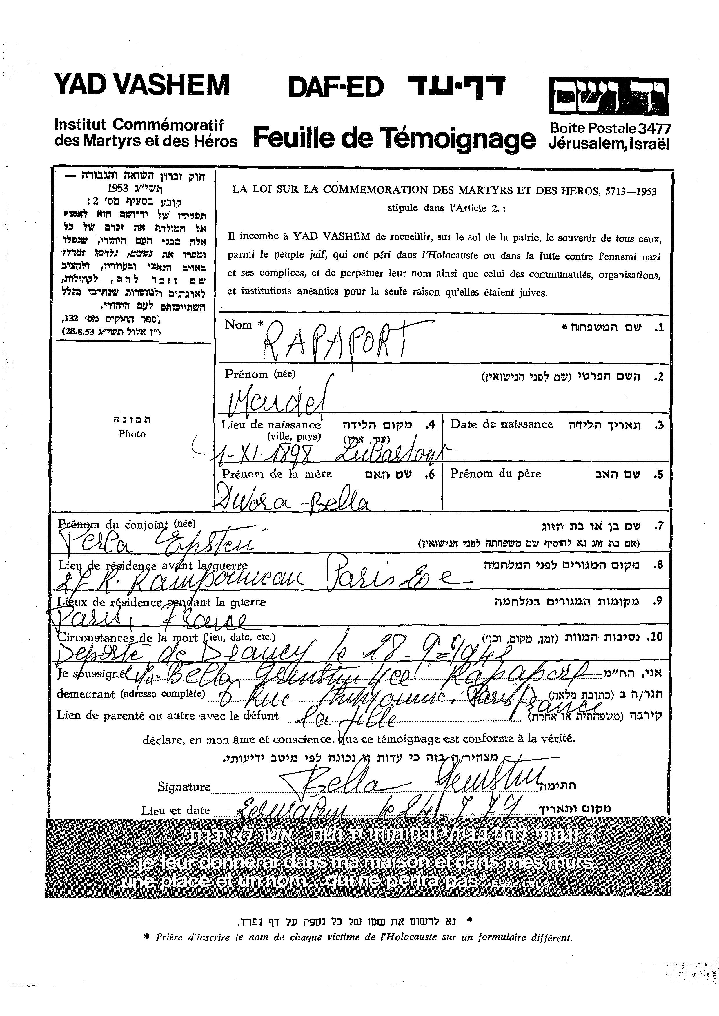 מנדל רפפורט נולד בLubartow שבפולין בשנת 1898 לDwora Bella. הוא היה נשוי לPerla לבית אפשטיין. לפני מלחמת העולם השניה התגורר בParis שבצרפת. בזמן המלחמה הוא היה בParis שבצרפת. מנדל נרצח בשואה. מקום המוות: Drancy שבצרפת בשנת 1942.