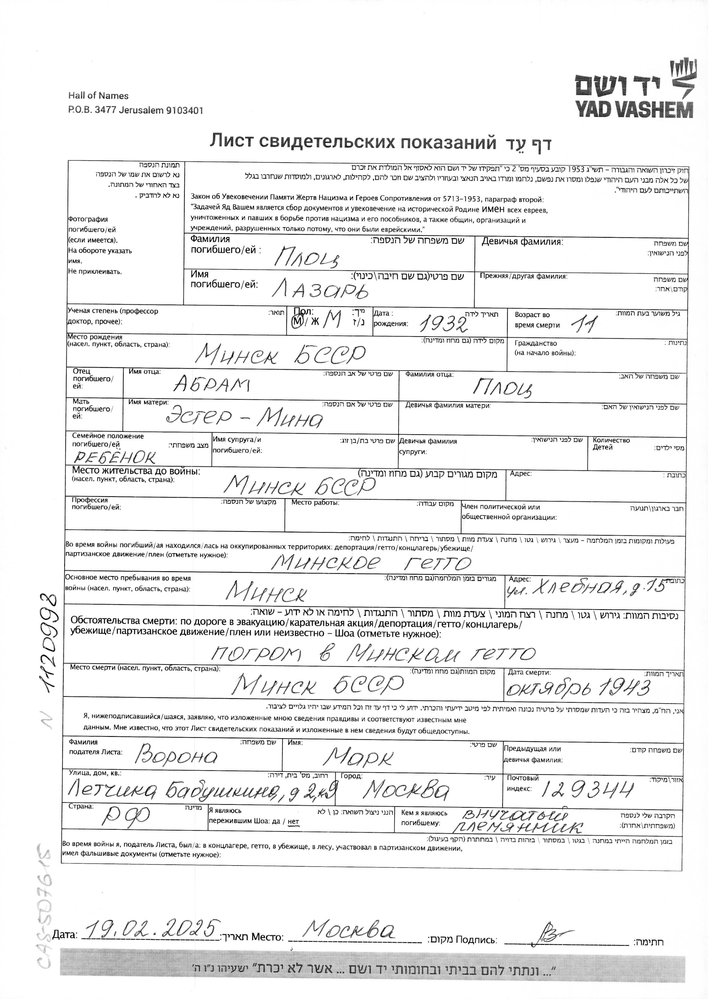 Lazar Plotz נולד בMinsk שבביאלורוסיה (ברה"מ) בשנת 1932 לAbram וEster Mina. הוא היה ילד. לפני מלחמת העולם השניה התגורר בMinsk שבביאלורוסיה (ברה"מ). בזמן המלחמה הוא היה בMinsk שבביאלורוסיה (ברה"מ). הוא נרצח בשואה. מקום המוות: Minsk שבביאלורוסיה (ברה"מ) בשנת 10/1943.