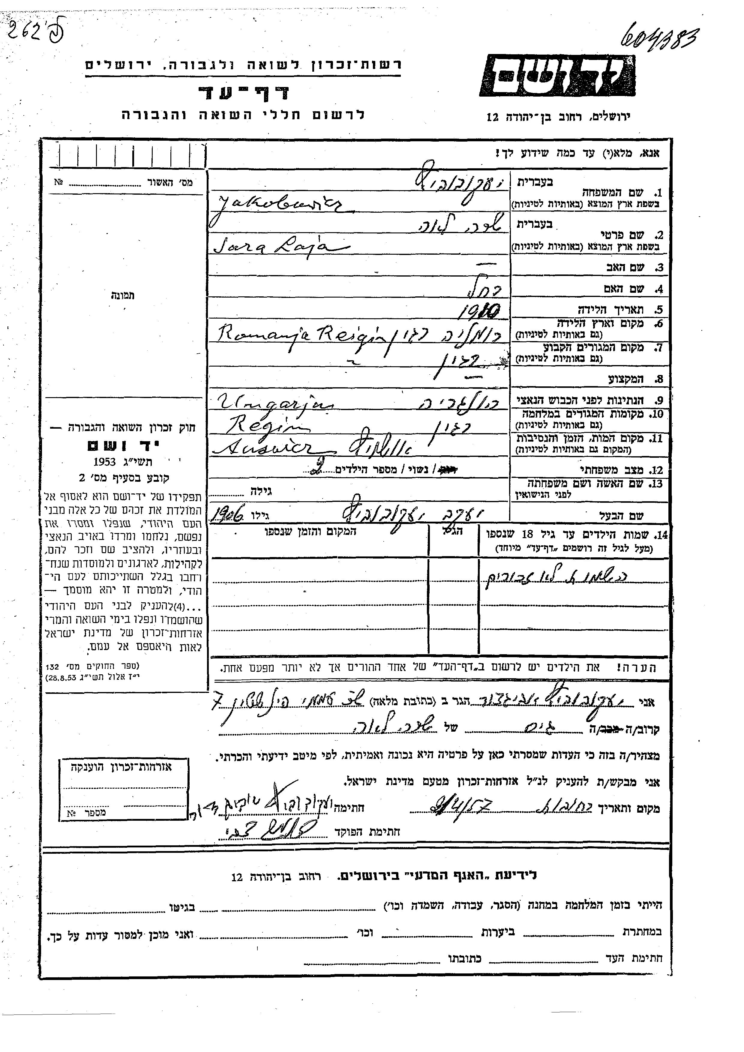 Jakobovicz Laja שרה 1910 Reghin, רומניה דף-עד