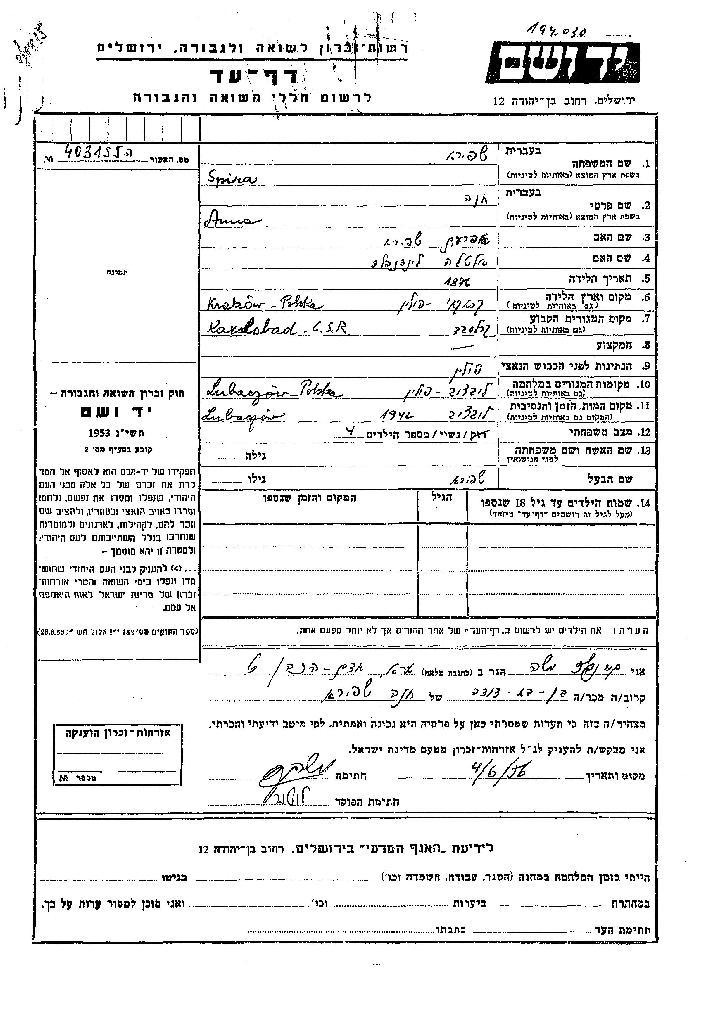 אנה חנה ספירא נולדה בKrakow שבפולין בשנת 1876 לאפרעם ואלטלה. היא היתה נשואה. לפני מלחמת העולם השניה התגוררה בKarlsbad שבצ'כוסלובקיה. בזמן המלחמה היא היתה בLubaczow שבפולין. אנה חנה נרצחה בשואה. מקום המוות: Lubaczow שבפולין בשנת 1942.