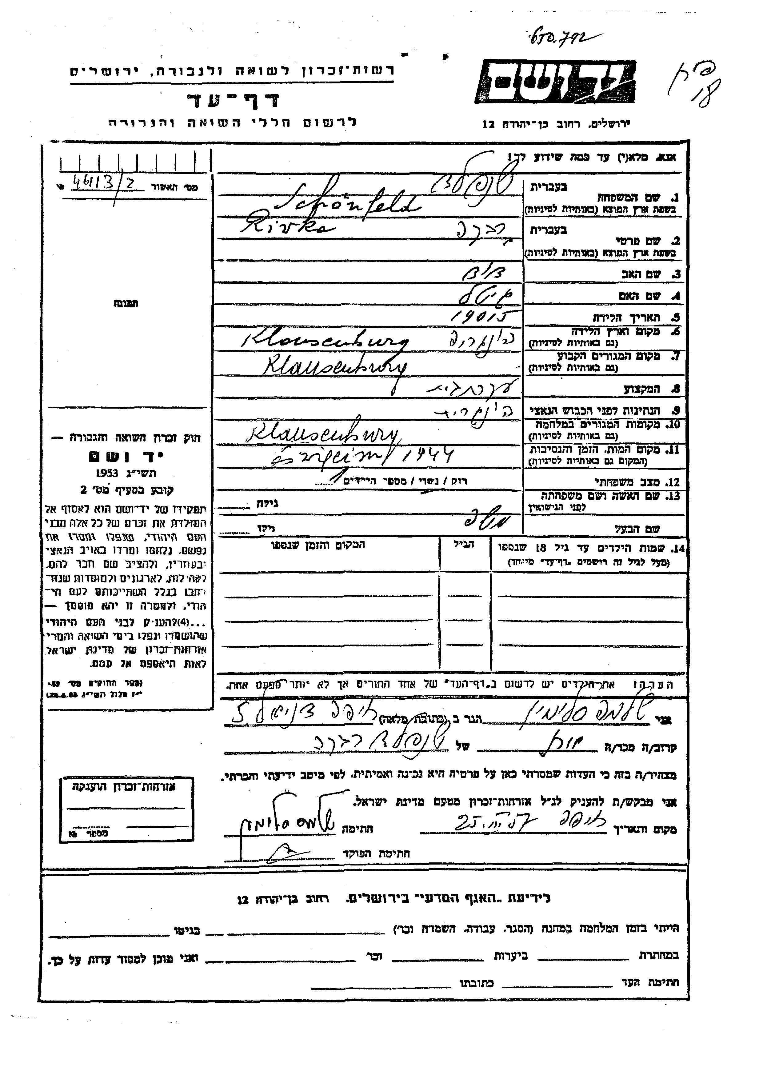 Riwka Schoenfeld נולדה בKlausenburg שברומניה בשנת 1915 לדוד וגיטל. היא היתה עקרת בית ונשואה למשה. לפני מלחמת העולם השניה התגוררה בKlausenburg שברומניה. בזמן המלחמה היא היתה בKlausenburg שברומניה.