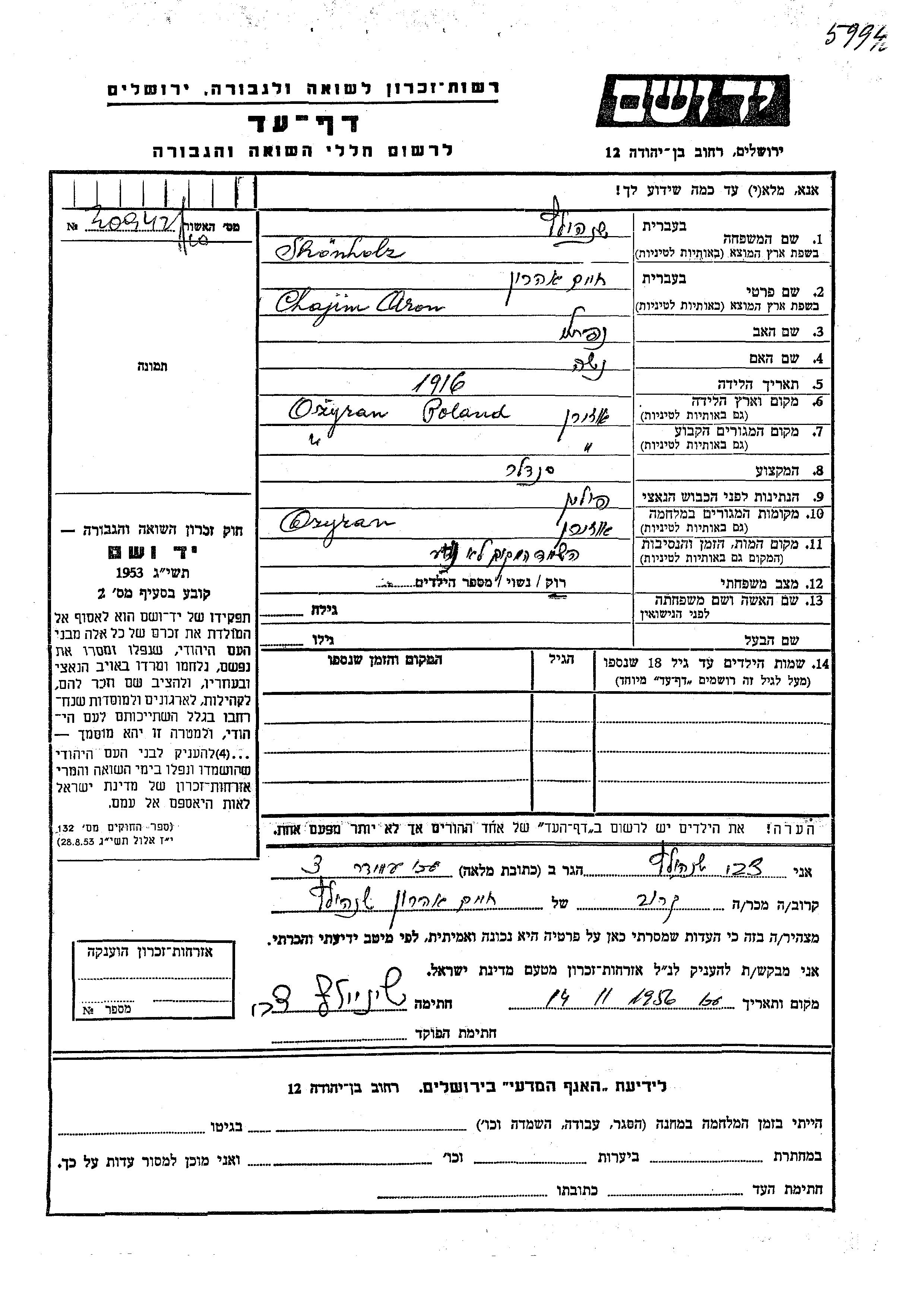 Chajim ארון Shoenholz נולד בOzyeran שבפולין בשנת 1916 לנפתלי ונשה נטה. הוא היה סנדלר ורווק. לפני מלחמת העולם השניה התגורר בOzyeran שבפולין. בזמן המלחמה הוא היה בOzyeran שבפולין. הוא נרצח בשואה.