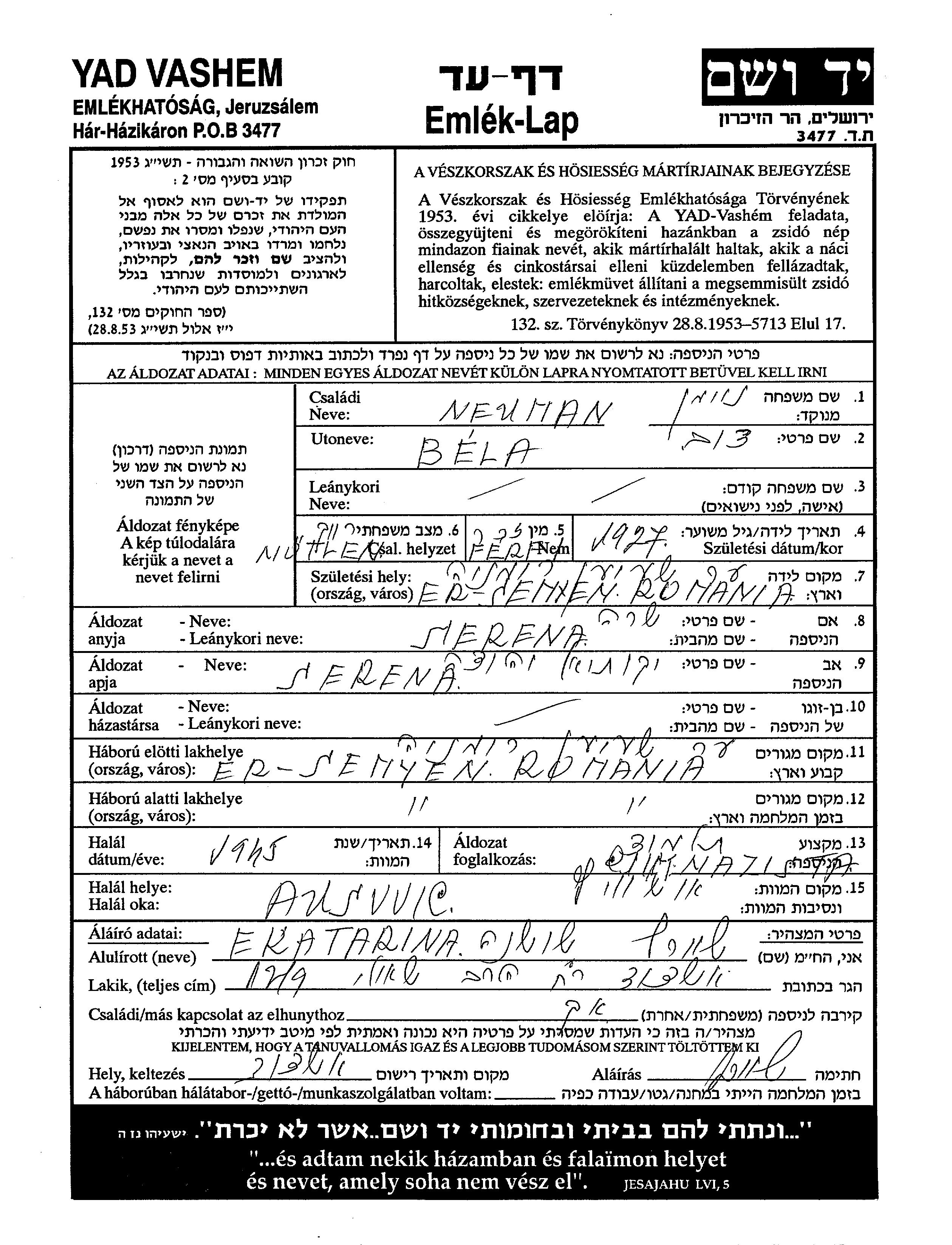 דוב בלה Neuman נולד בErsemjen שברומניה בשנת 1927 לSerena יקותיאל יהודה וSerena. הוא היה רווק. לפני מלחמת העולם השניה התגורר בErsemjen שברומניה. בזמן המלחמה הוא היה בErsemjen שברומניה.