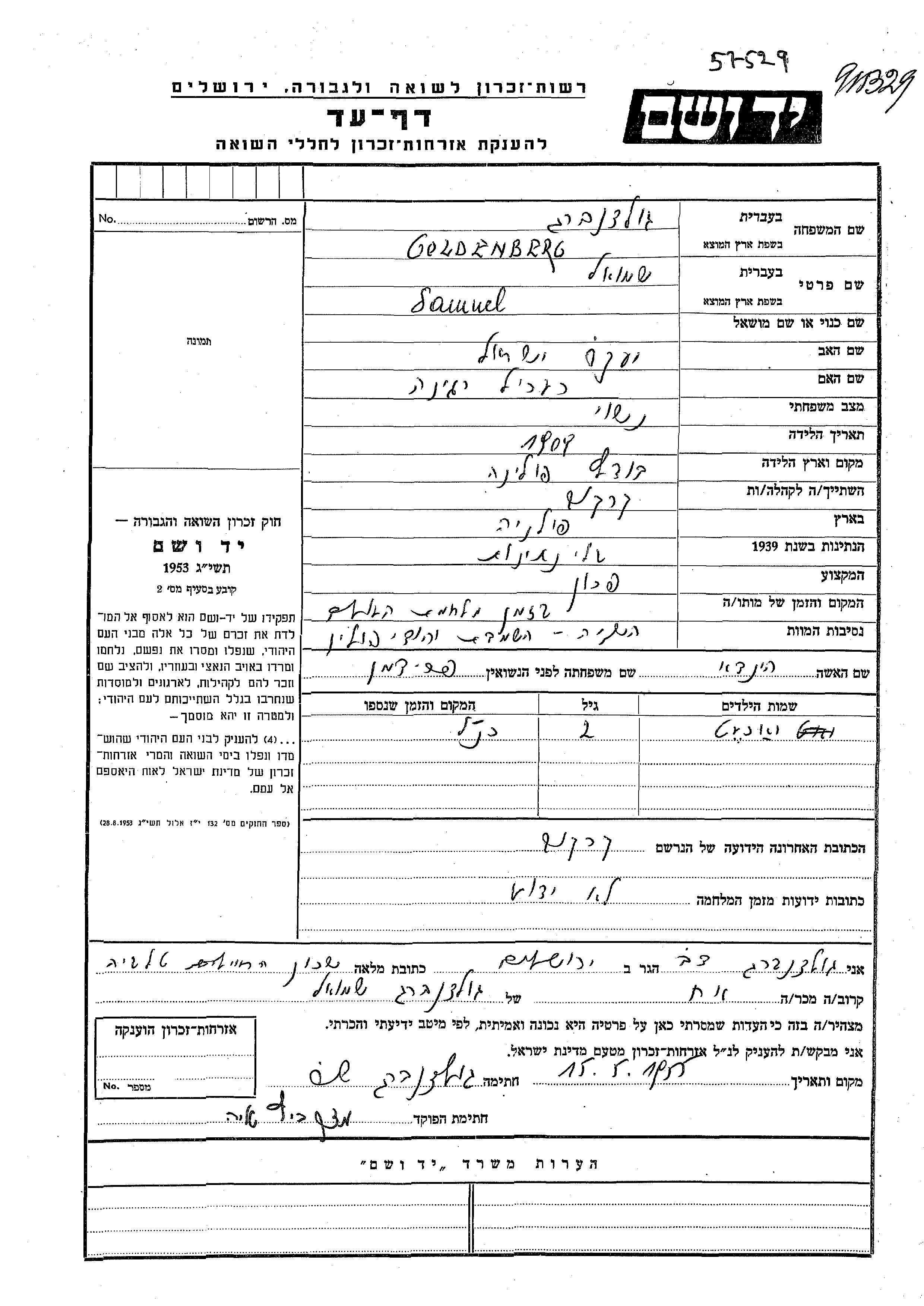 שמואל גולדנברג נולד בBuczacz שבפולין בשנת 1908 ליעקב ישראל ורגינה רעכיל. הוא היה פרוון ונשוי להינדא לבית פרידמן. לפני מלחמת העולם השניה התגורר בKrakow שבפולין. שמואל נרצח בשואה.