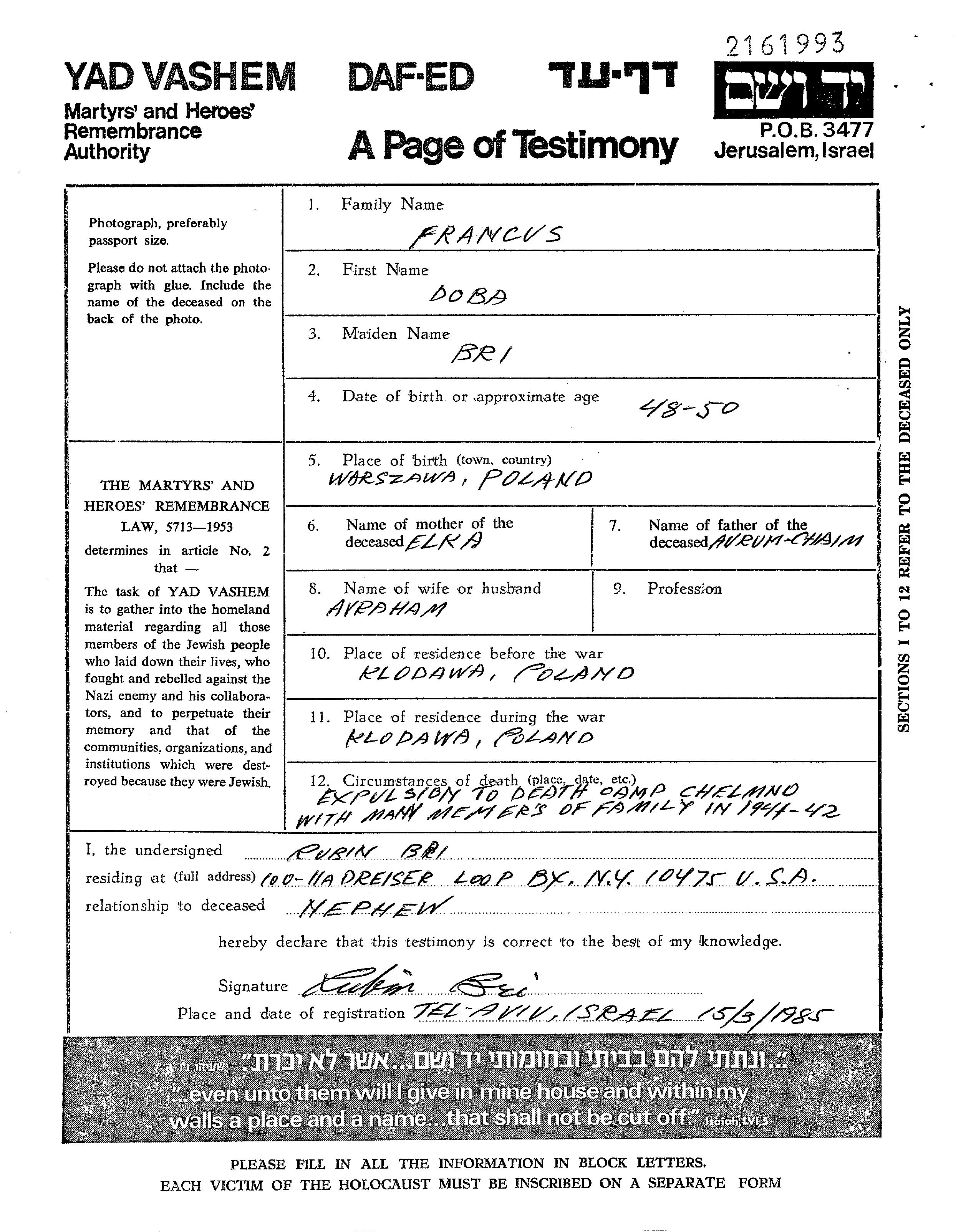 דובה נרצחה בשואה. מקום המוות: Chelmno שבפולין בשנת 1942.