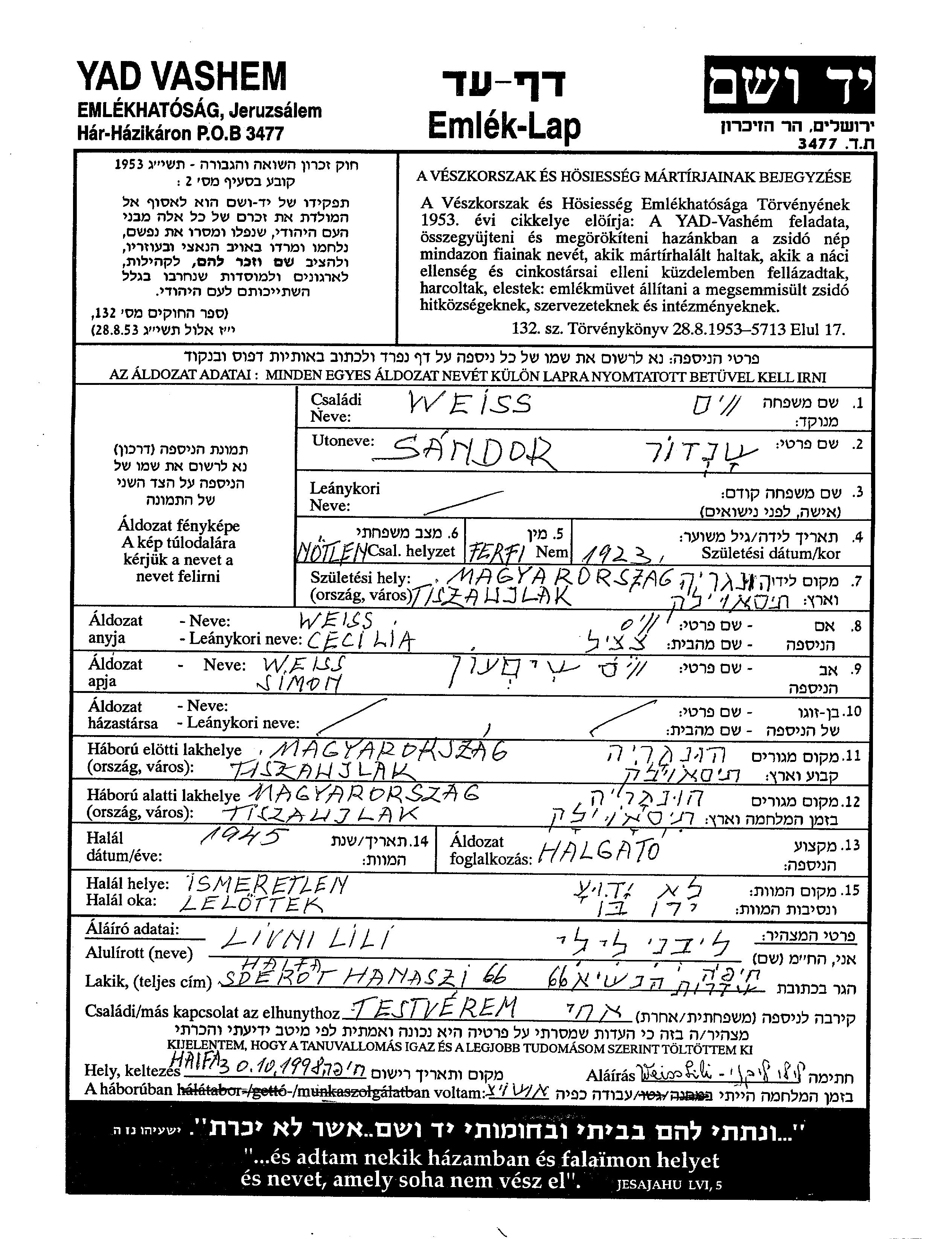 סנדור Weiss נולד בTiszaujlak שבצ'כוסלובקיה בשנת 1923 לשימעון וCecilia. הוא היה Halgato ורווק. לפני מלחמת העולם השניה התגורר בTiszaujlak שבצ'כוסלובקיה. בזמן המלחמה הוא היה בTiszaujlak שבצ'כוסלובקיה. סנדור נרצח בשואה. מקום המוות: לא ידוע בשנת 1945.